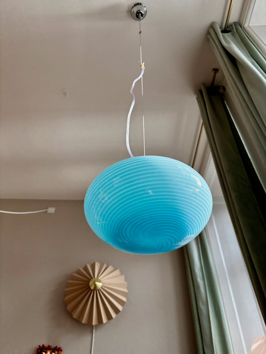 Kæmpe oval vintage Murano pendel i cloud blå swirl 47 cm