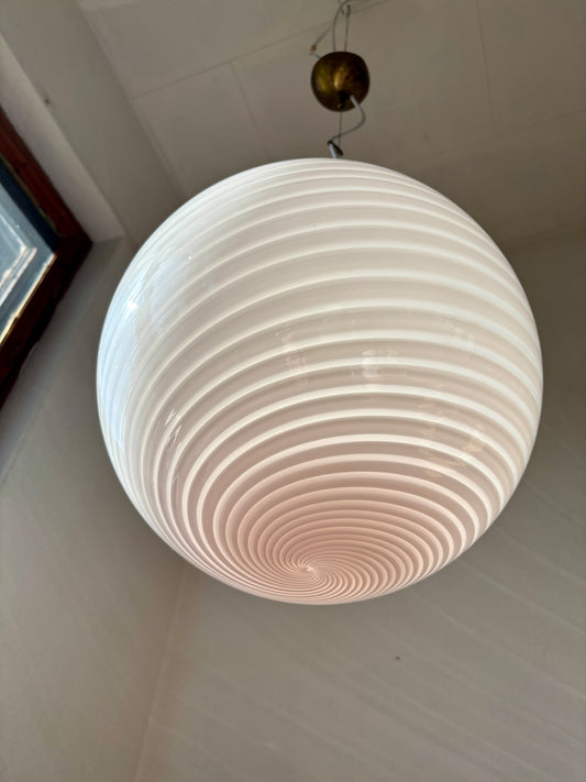 Kæmpe vintage Murano pendel med hvidt lyserødt swirl 56 cm