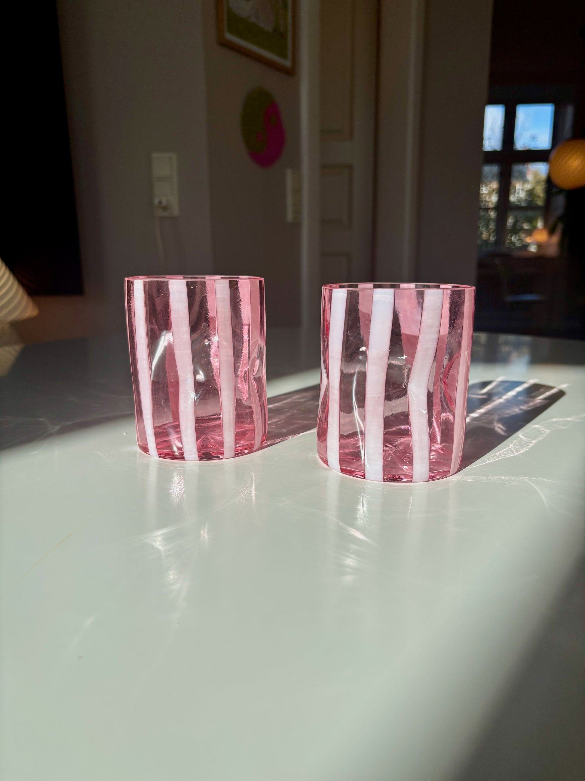 Italiensk mundblæst glas i lyserød med hvide striber