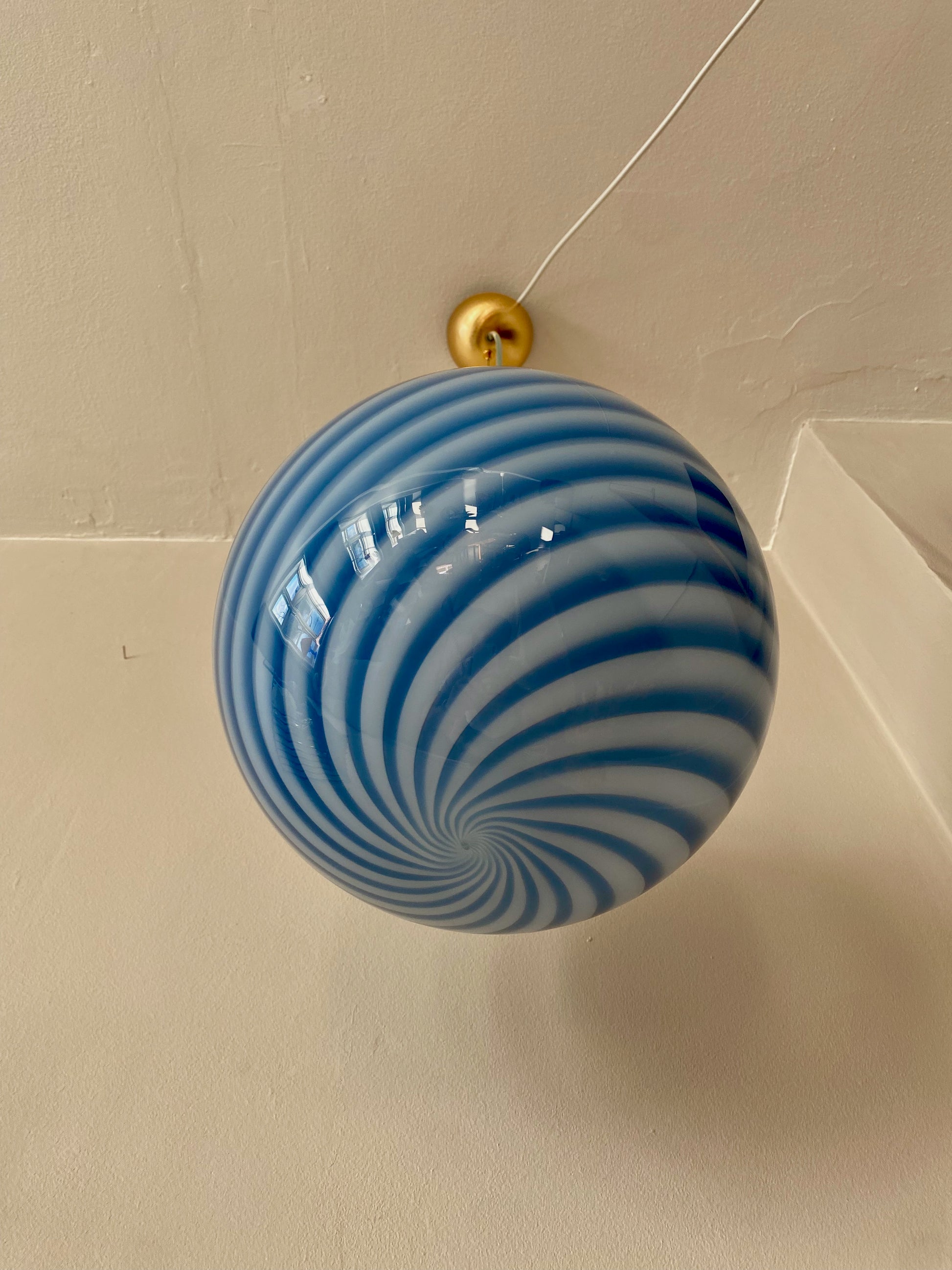 En ny smuk Murano loftslampe i blåt swirl med messing ophæng. Glasset er mundblæst i en rund form med betagende swirl mønster. Da lampen er håndlavet kan der være små unikke forskelle i glasset og fra lampe til lampe.