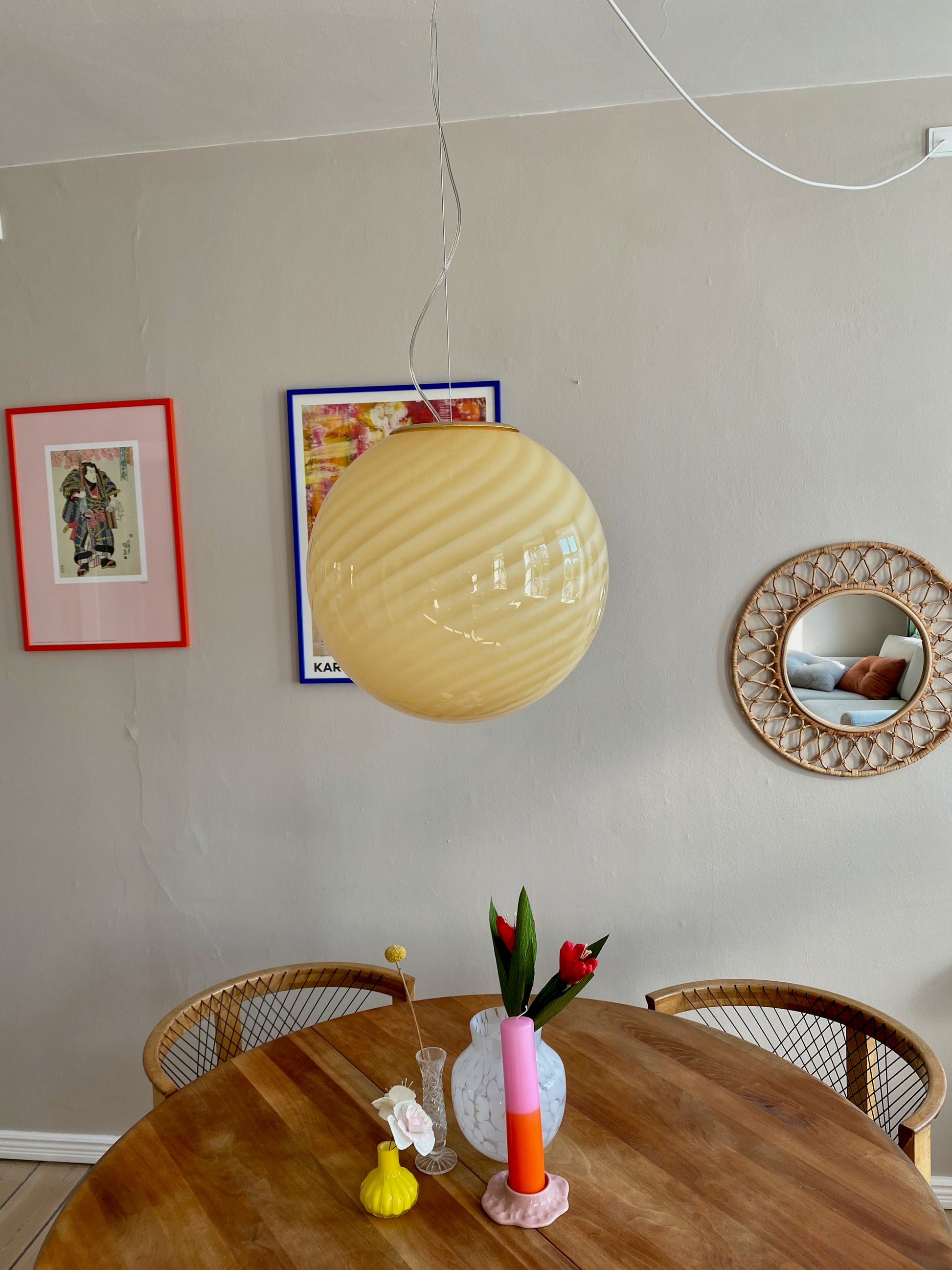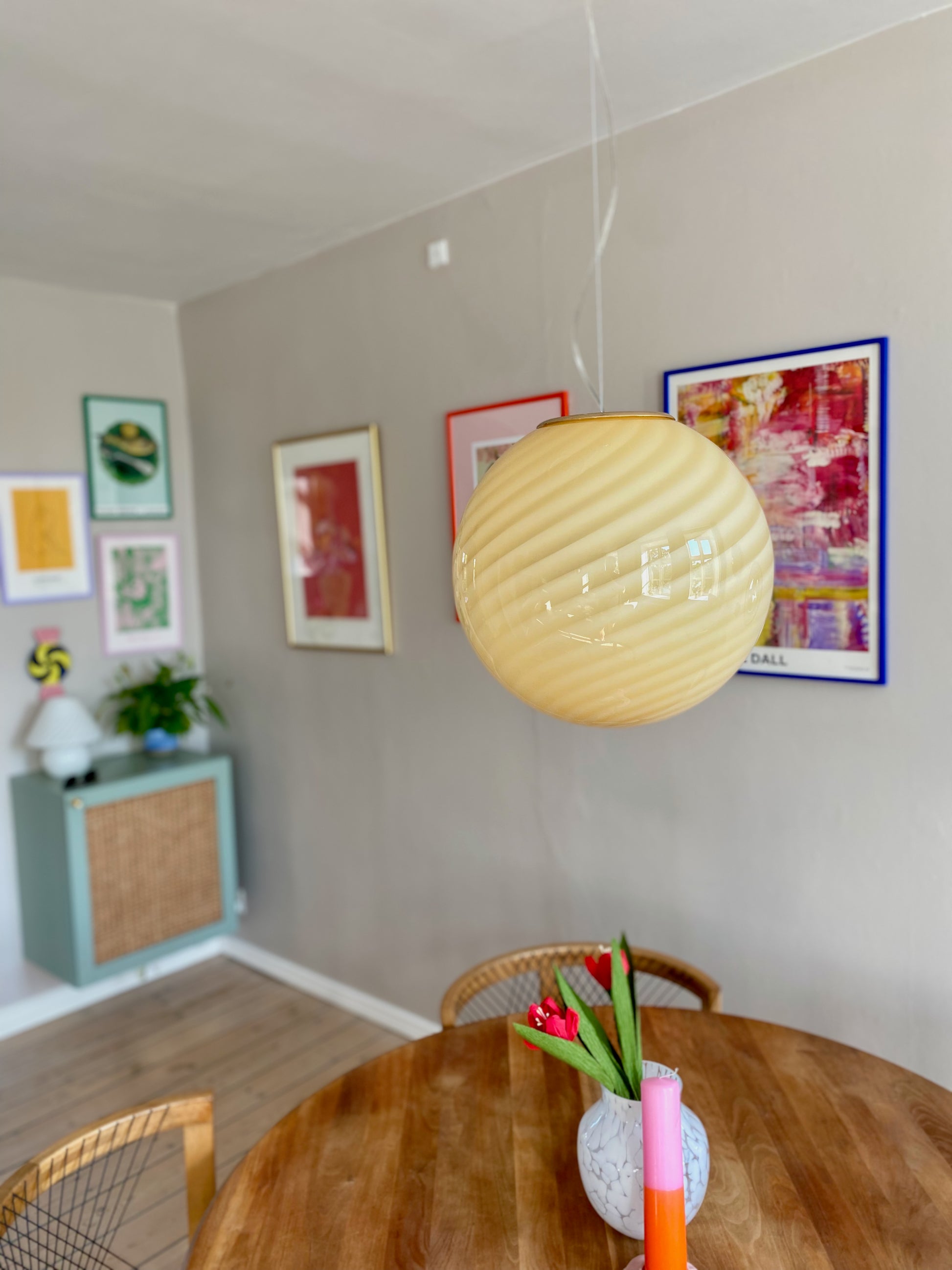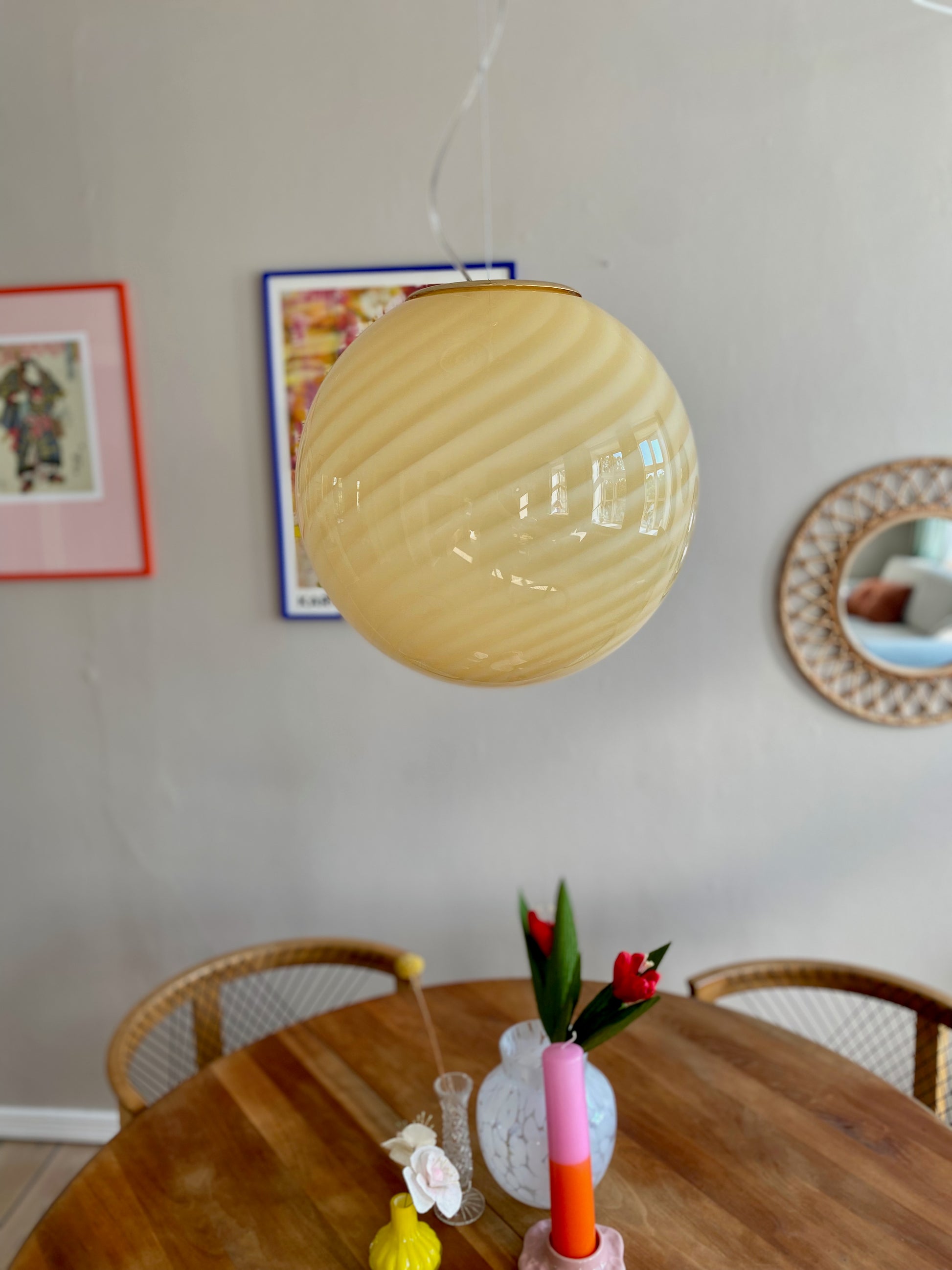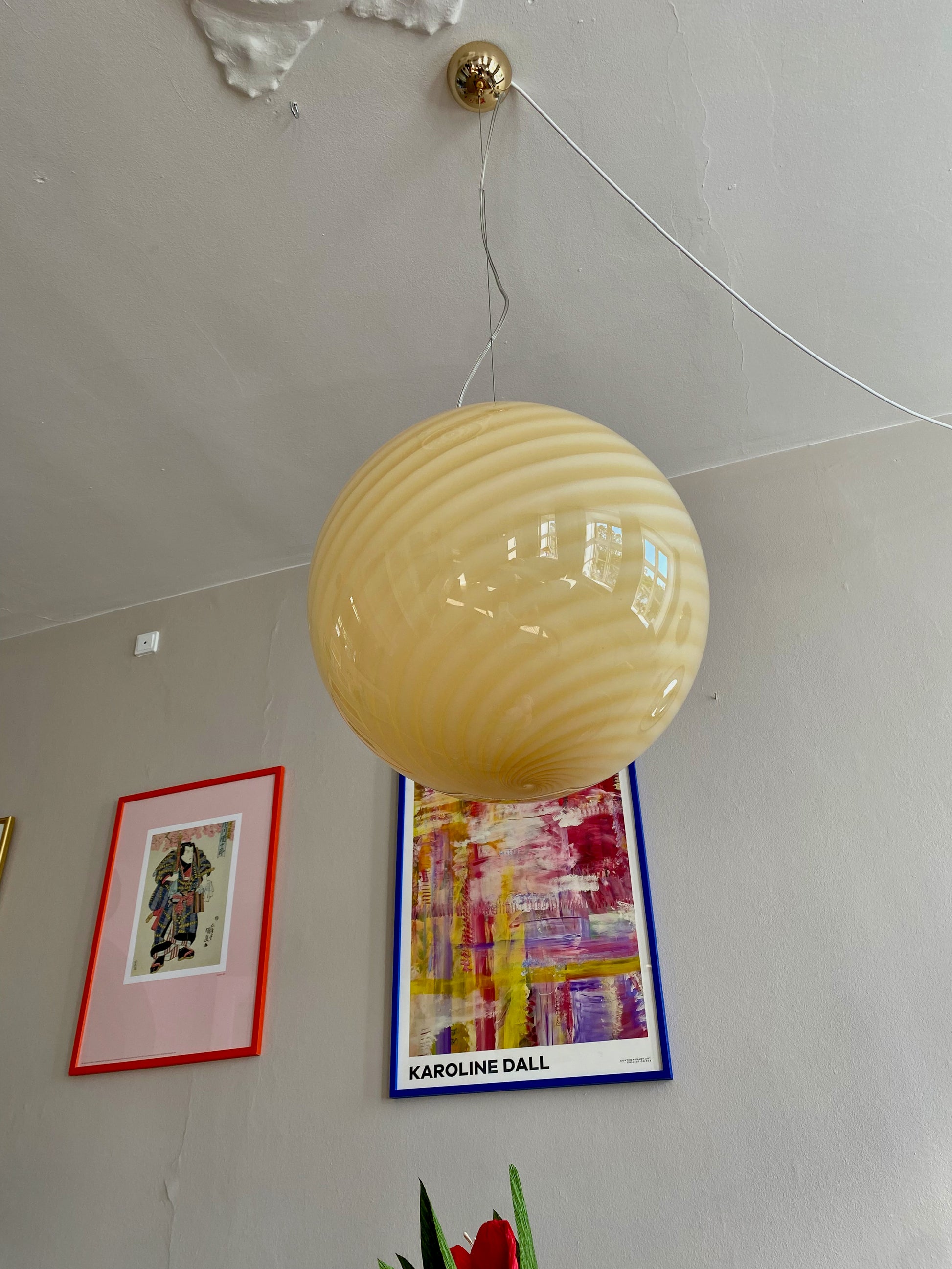 En ny smuk Murano loftslampe i gult swirl med messing ophæng. Glasset er mundblæst i en rund form med betagende swirl mønster. Da lampen er håndlavet kan der være små unikke forskelle i glasset og fra lampe til lampe.