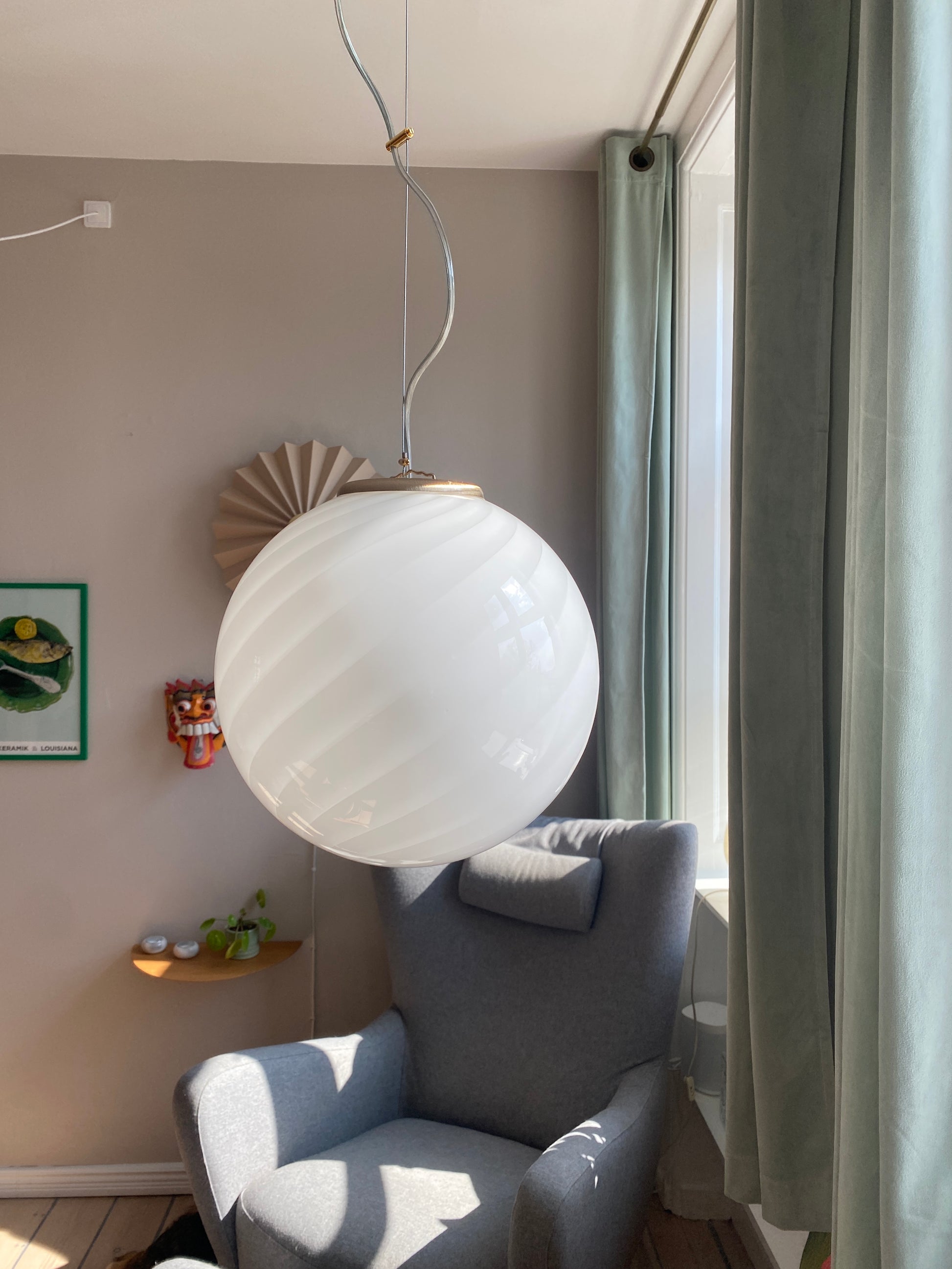 Ny smuk Murano loftslampe i hvid swirl med messing ophæng. Glasset er mundblæst i en rund form med betagende swirl mønster. Da lampen er håndlavet kan der være små unikke forskelle i glasset og fra lampe til lampe.