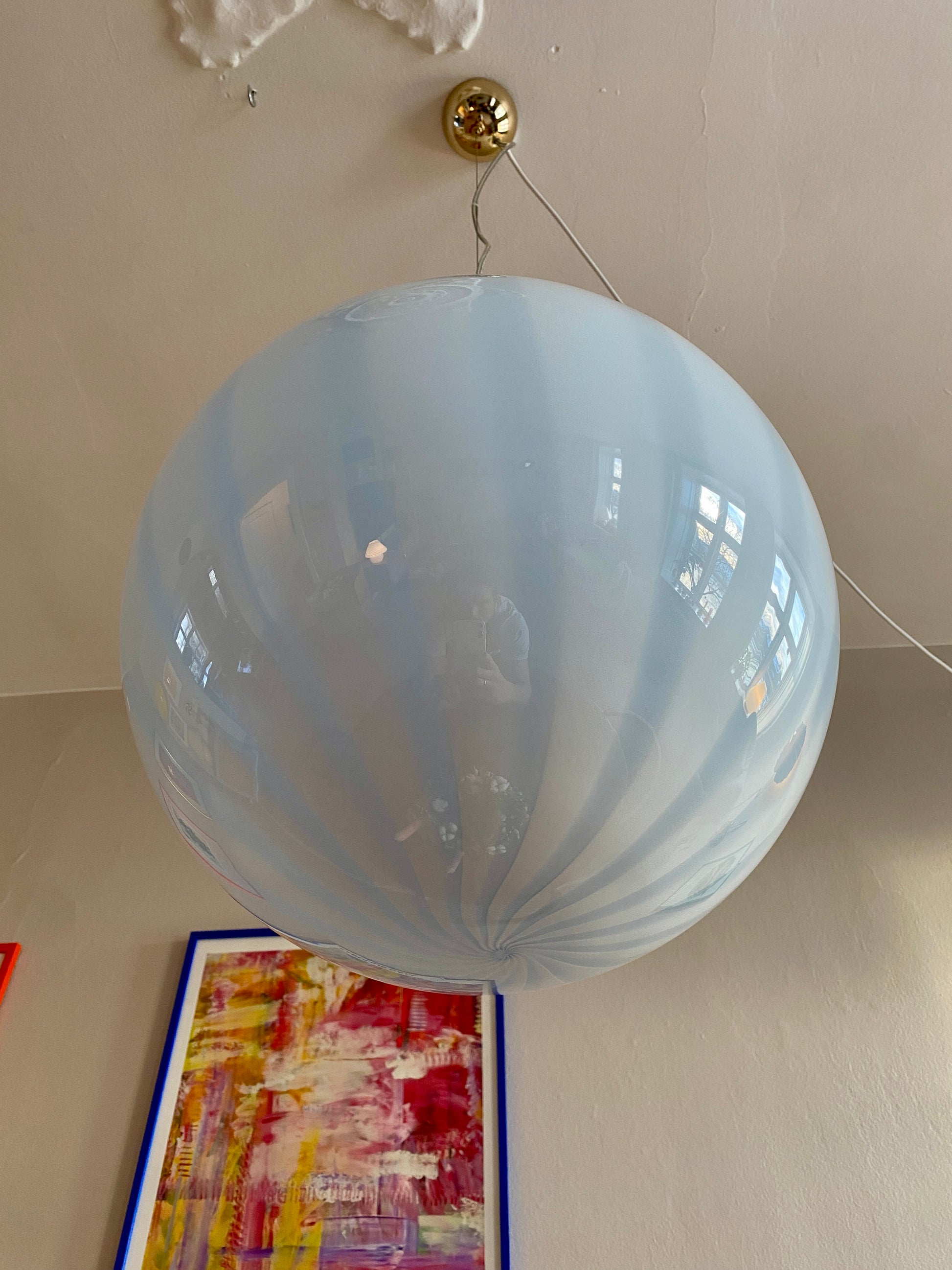 Smuk ny Murano loftslampe i den flotteste cloud blå farve, med messing ophæng. Glasset er mundblæst i en rund form med vertikale striber. Da lampen er håndlavet kan der være små unikke forskelle for lampe til lampe.