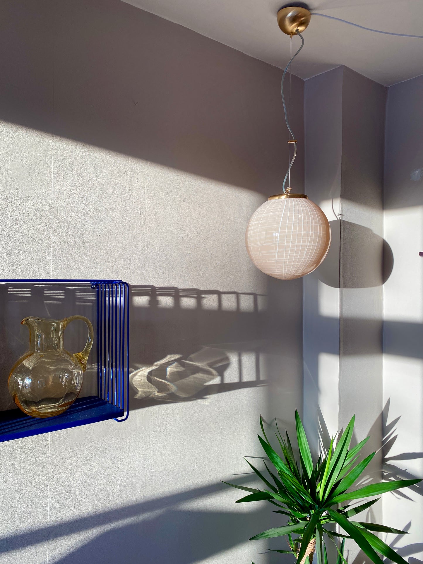 Den er lavet i beige med med et smukt filigrana mønster, glasset er stemplet med La Murrinas mærke, som det ses på 4. billede. Lampen måler 25 cm i diameter og kommer med ophænget vist på billedet.