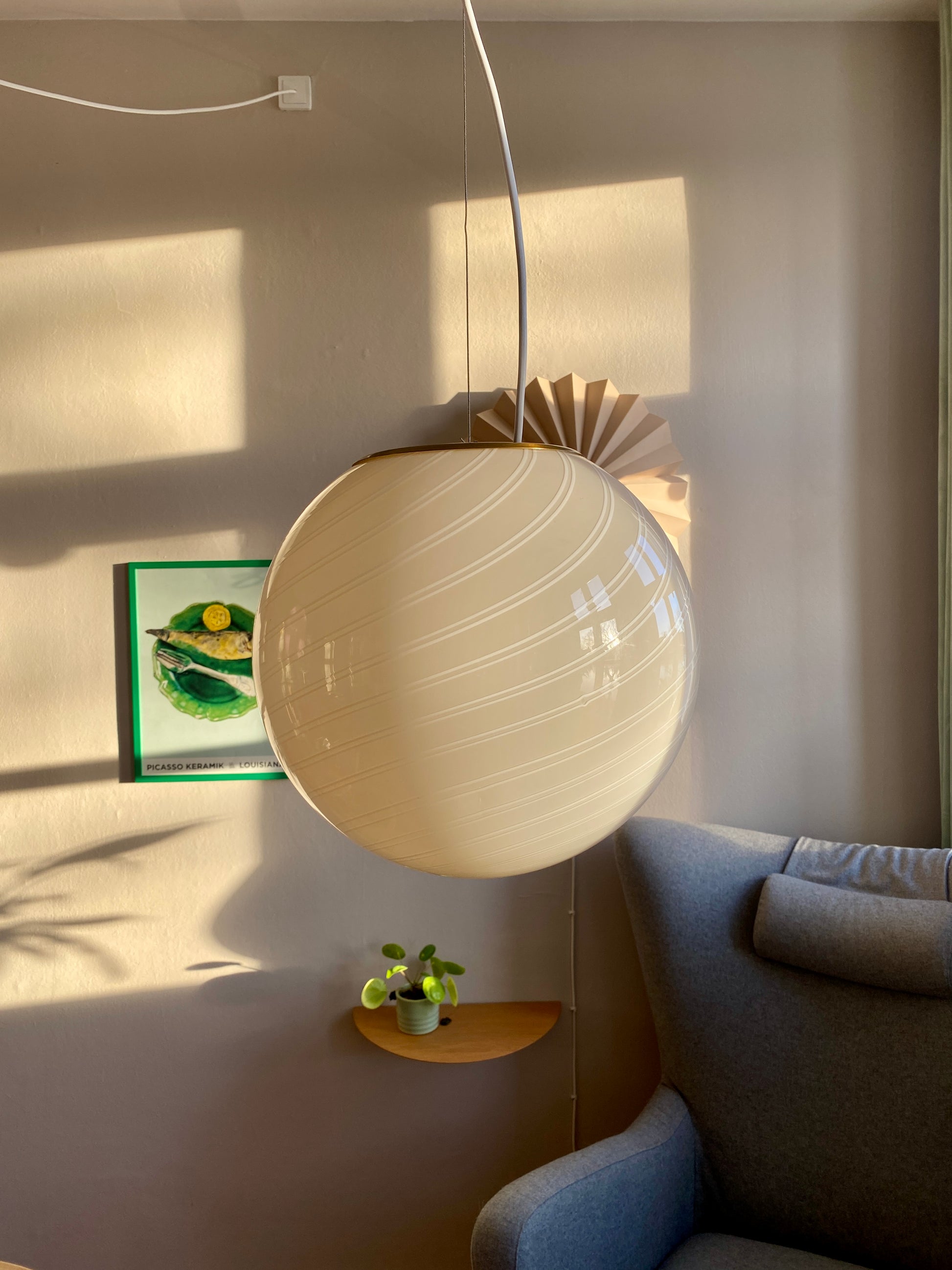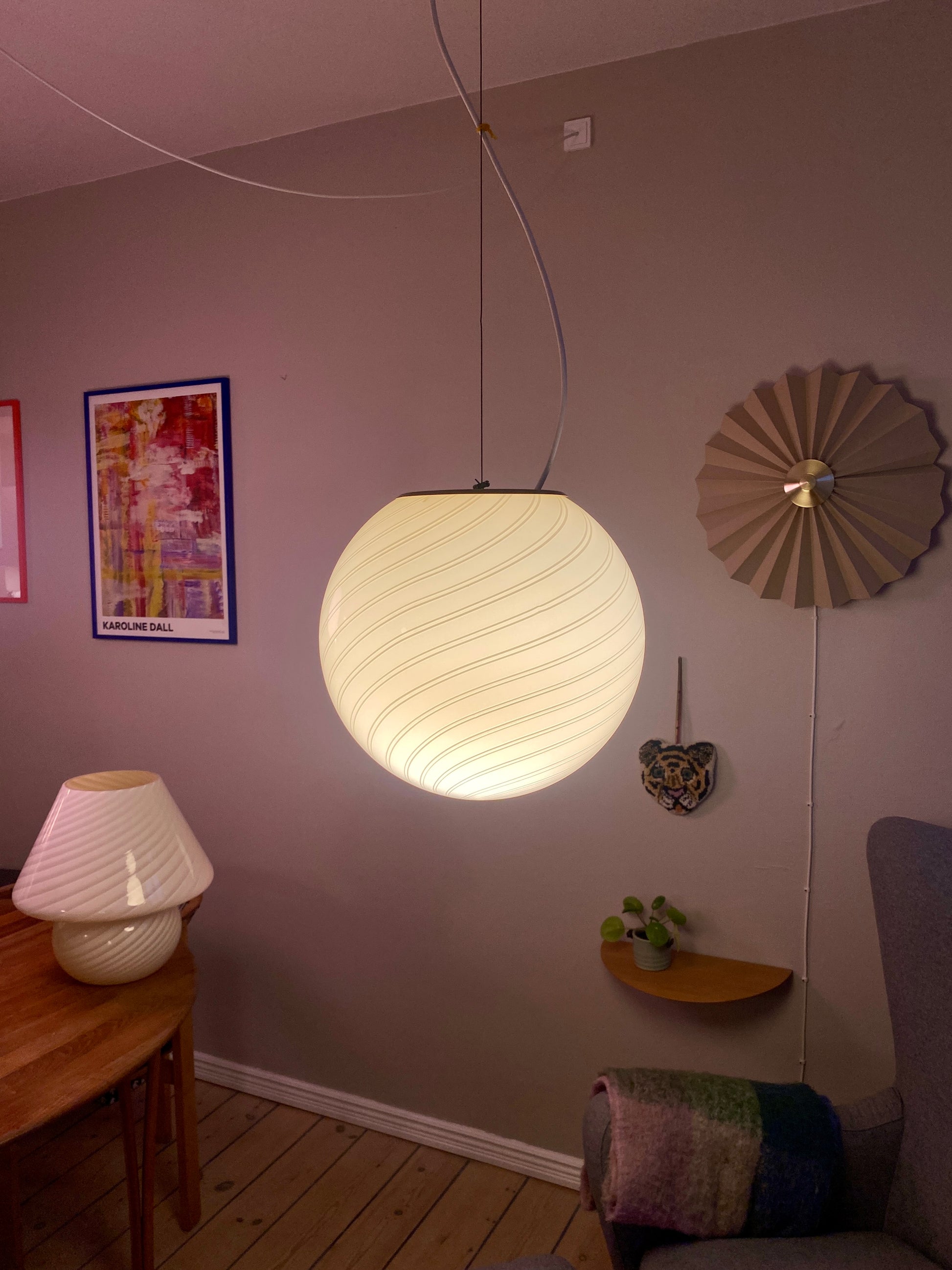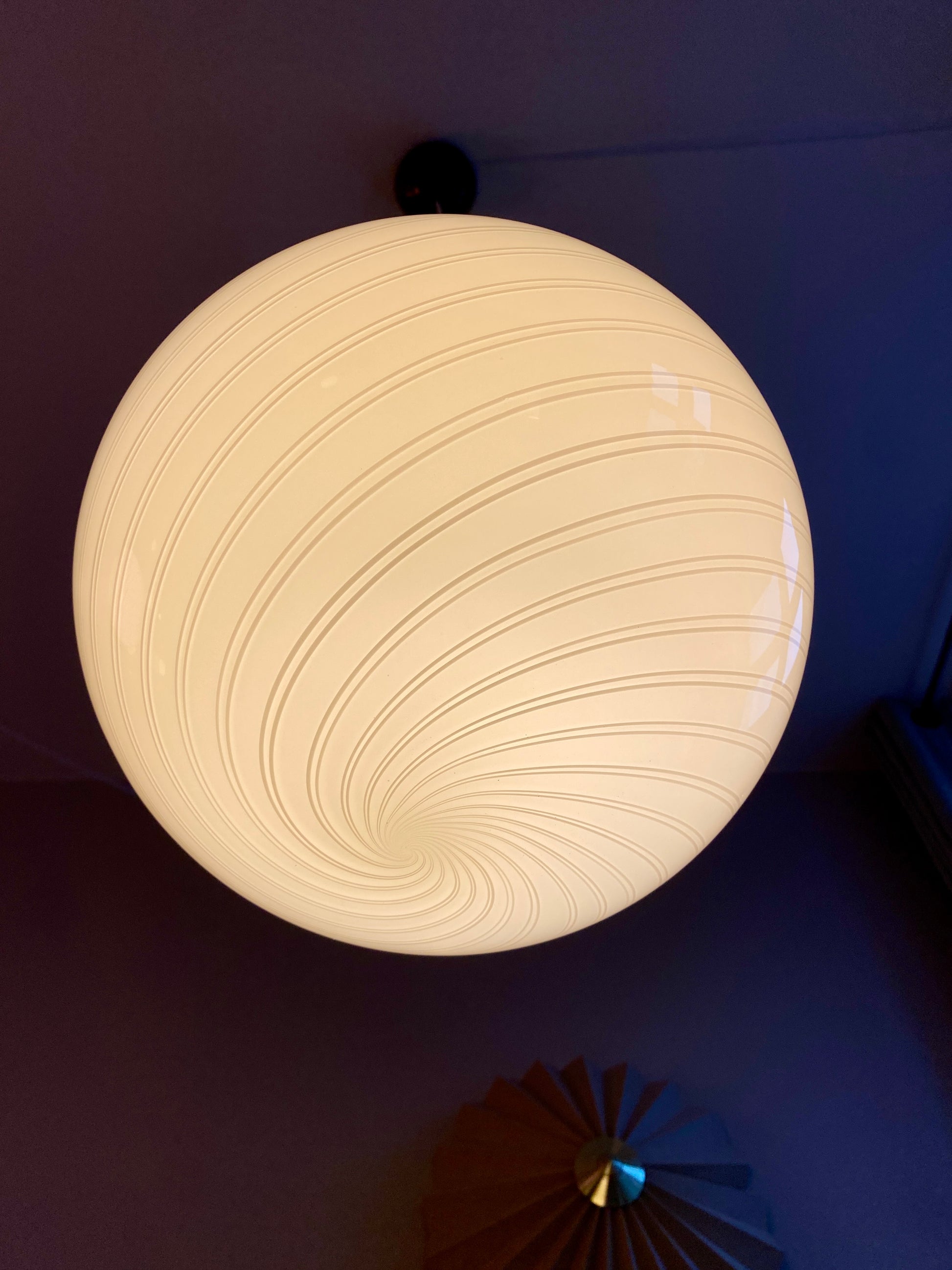 Vintage Murano pendel / loftslampe i creme gul dobbelt swirl med messing ophæng. Lampen er enorm smuk i sit swirl. Glasset er mundblæst i en rund form med betagende swirl mønster. Da lampen er håndlavet kan der være små unikke kendetegn ved glasset.
