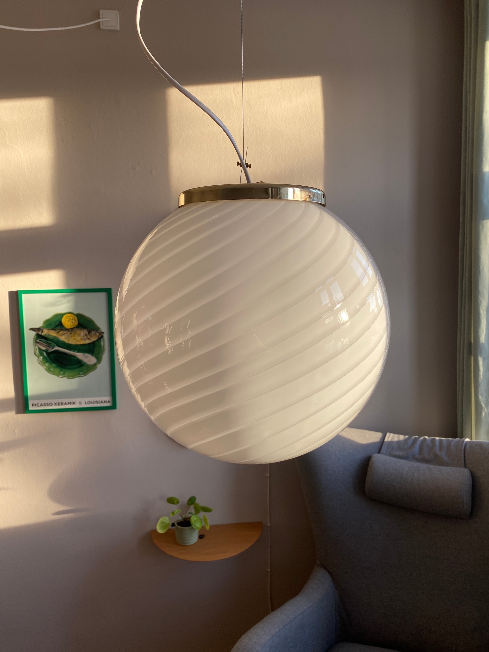 Vintage Murano loftslampe i hvid swirl med et super smukt messing ophæng. Lampen er enorm smuk i sit swirl og kommer med originalt Murano klistermærke og stammer fra Leucos & Artimede. Glasset er mundblæst i en rund form med betagende swirl mønster. Da lampen er håndlavet kan der være små unikke kendetegn ved glasset.