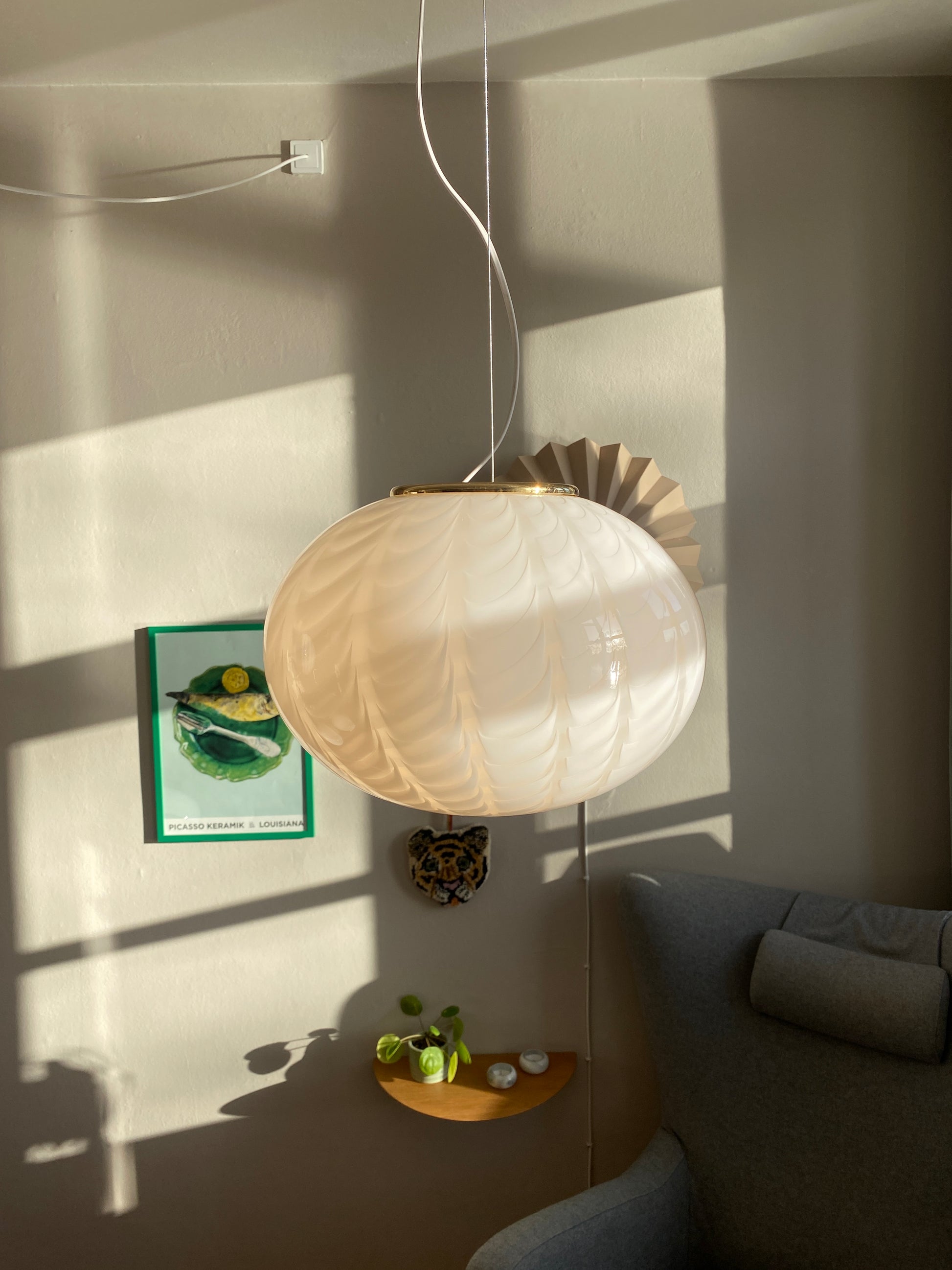 Smuk vintage pendel i hvid murano glas og kommer med et smukt messing ophæng.