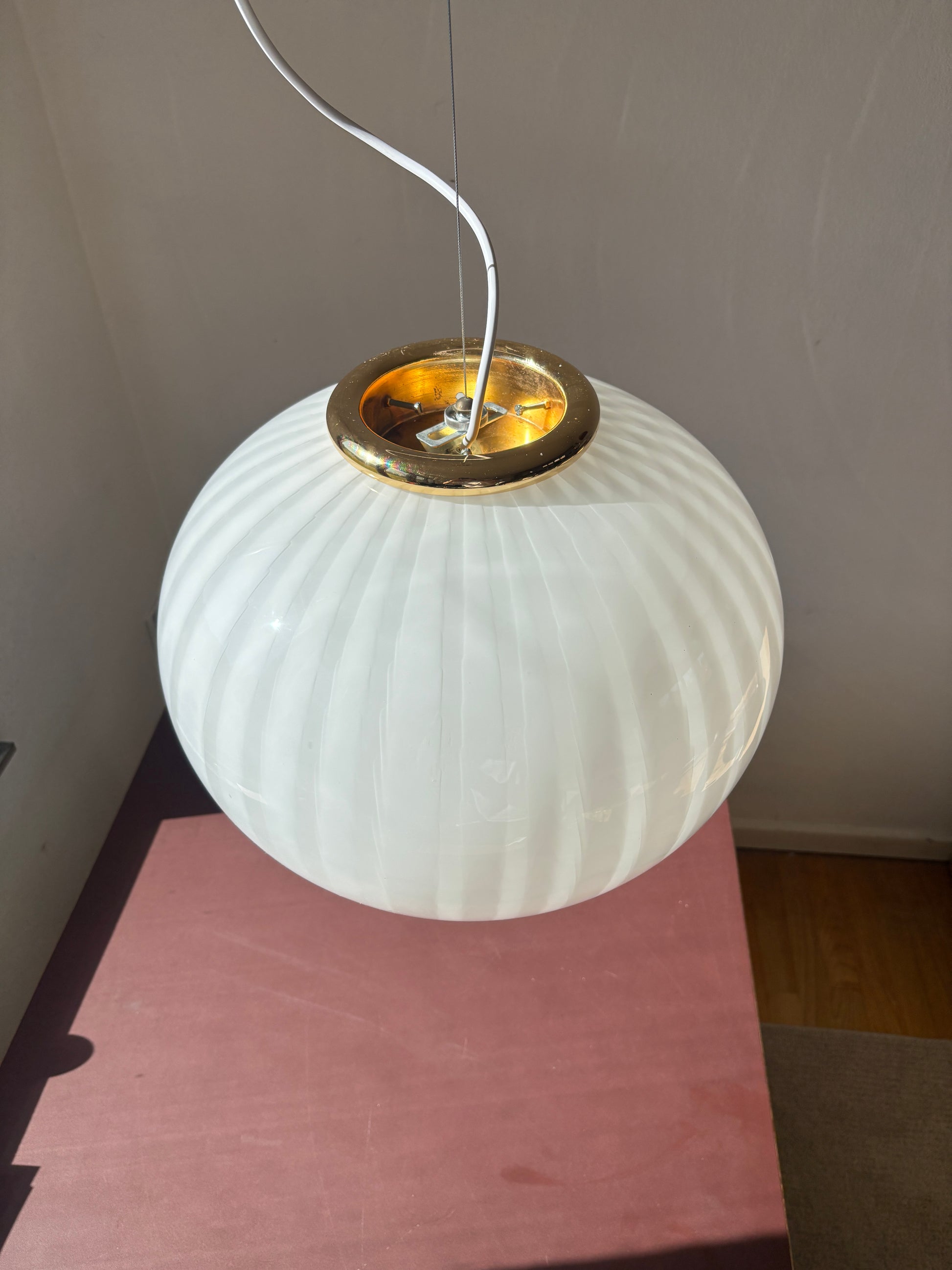 Smuk vintage pendel i hvid murano glas med peacock mønster og gyldent ophæng.