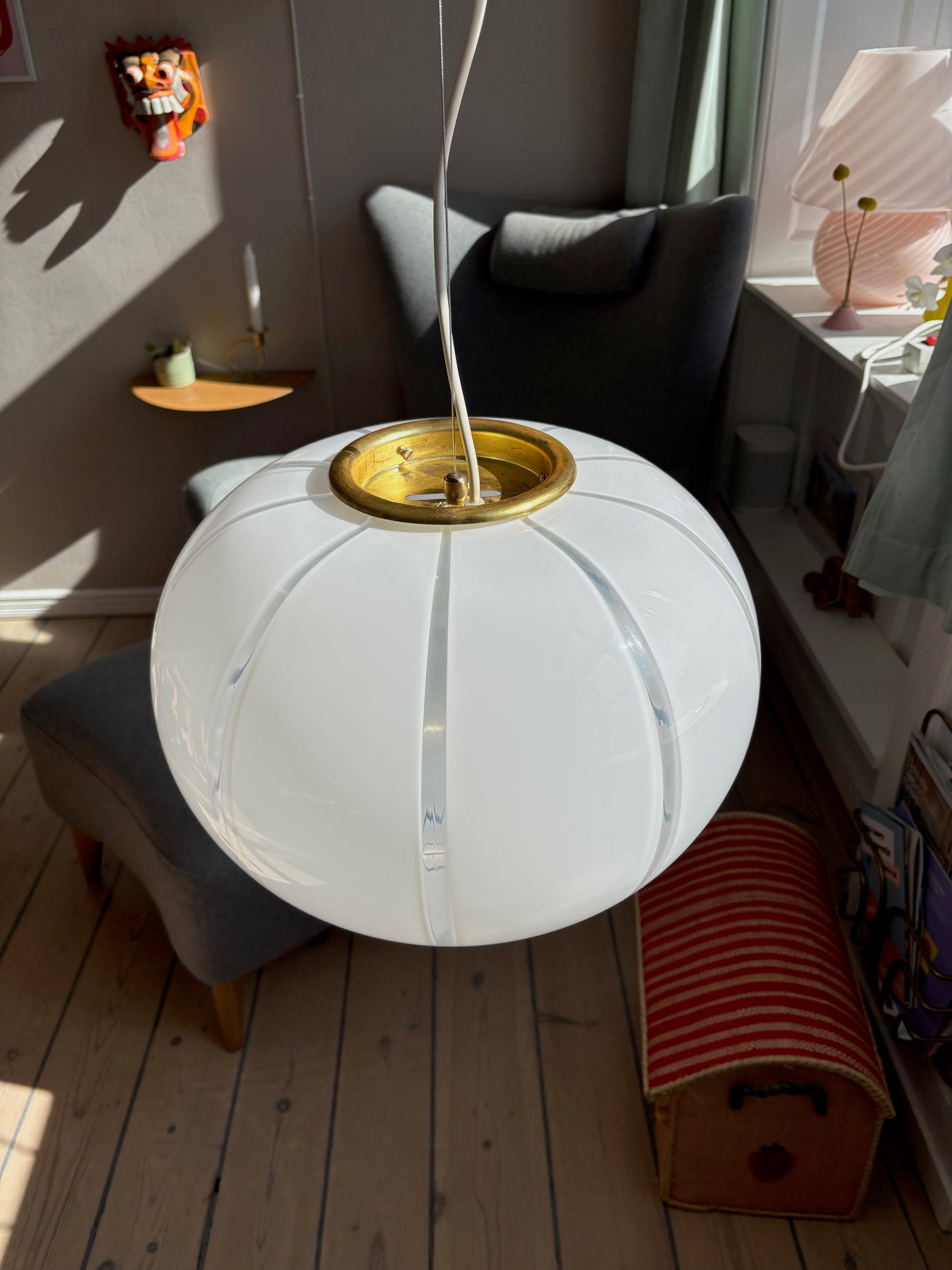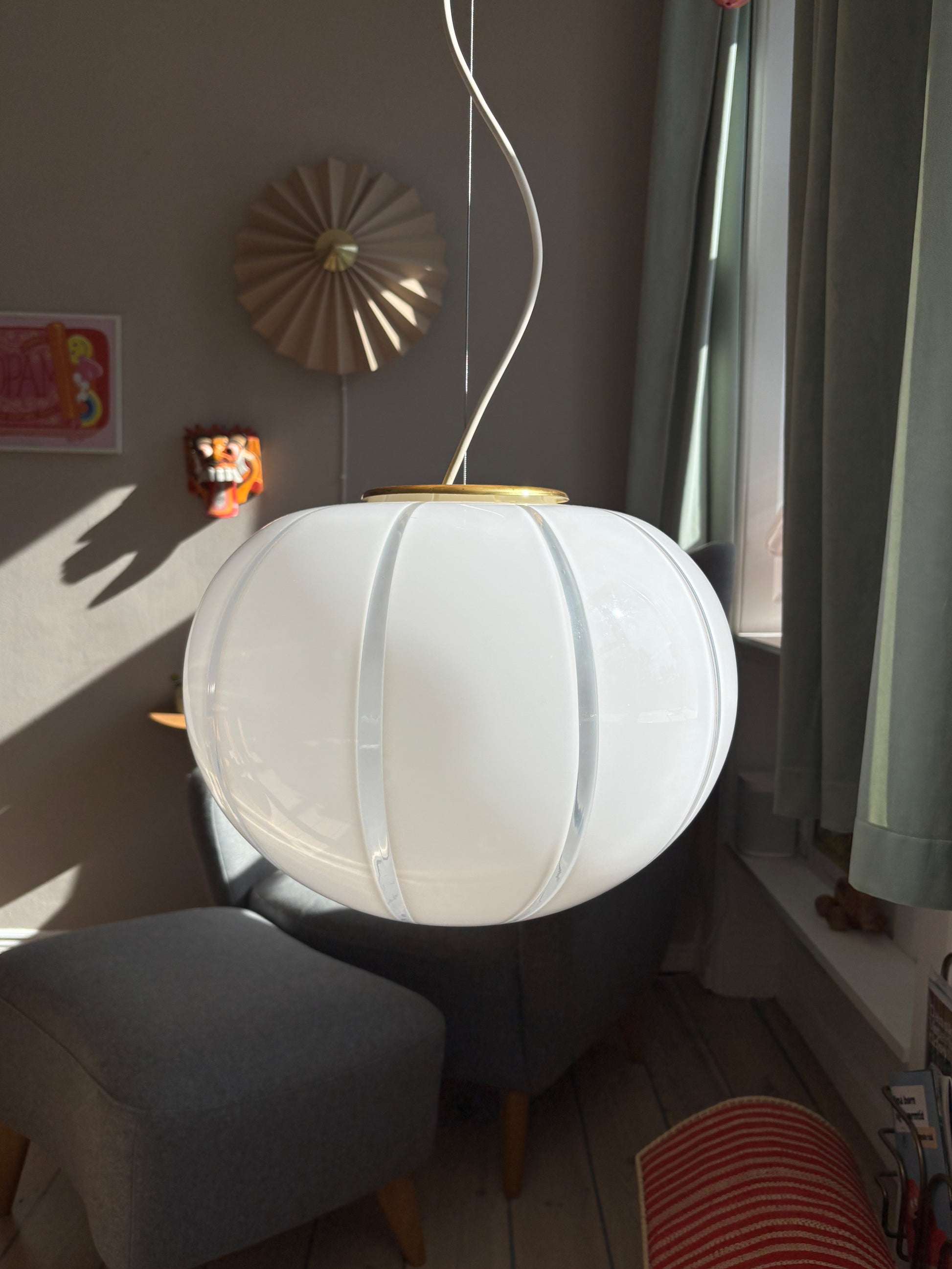 Stor og super smuk vintage pendel i hvid murano glas og kommer med gyldent ophæng.