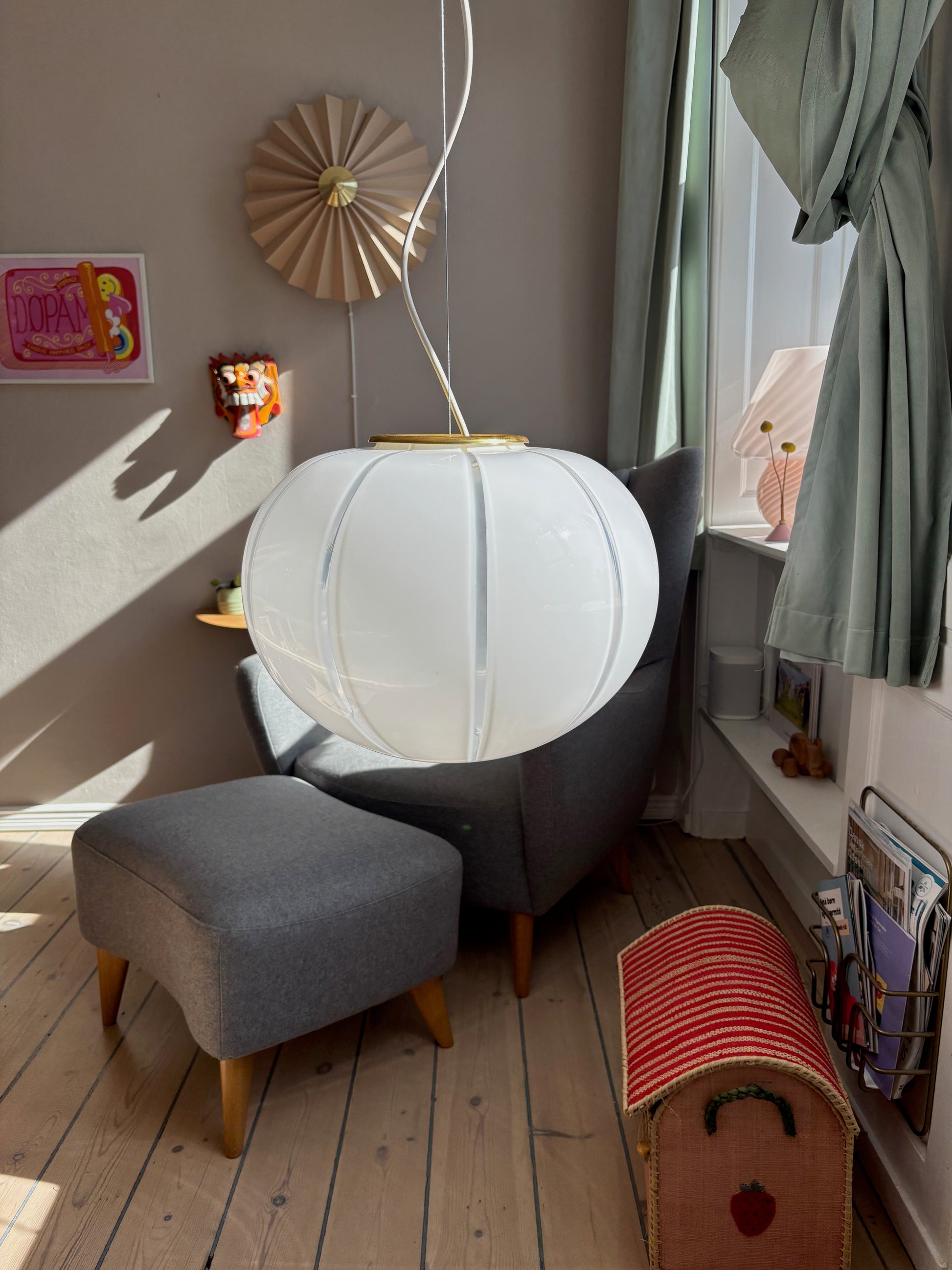 Loftslampen er mundblæst i en oval form med vertikale striber. Da lampen er håndlavet kan der være små unikke forskelle for lampe til lampe.