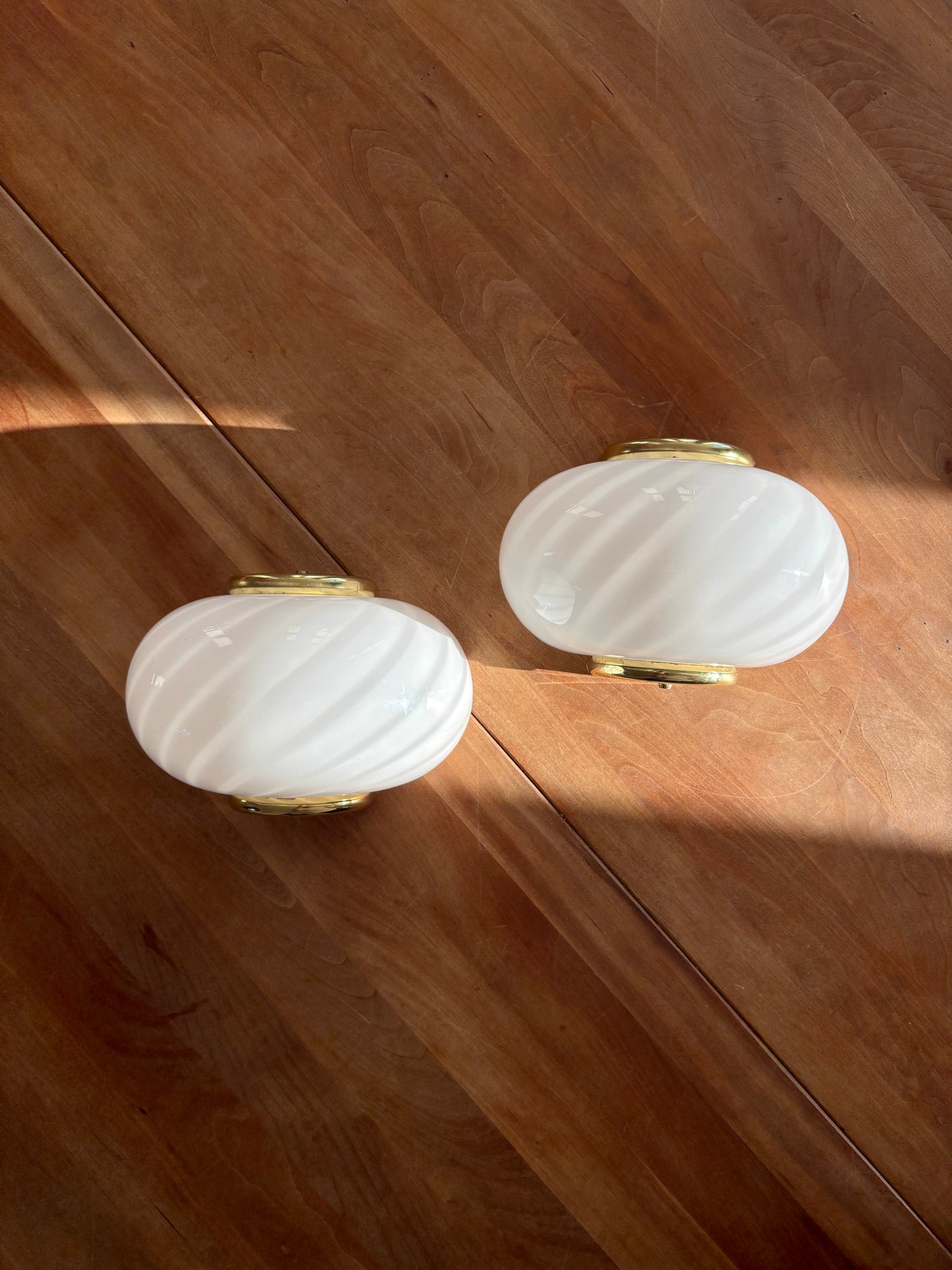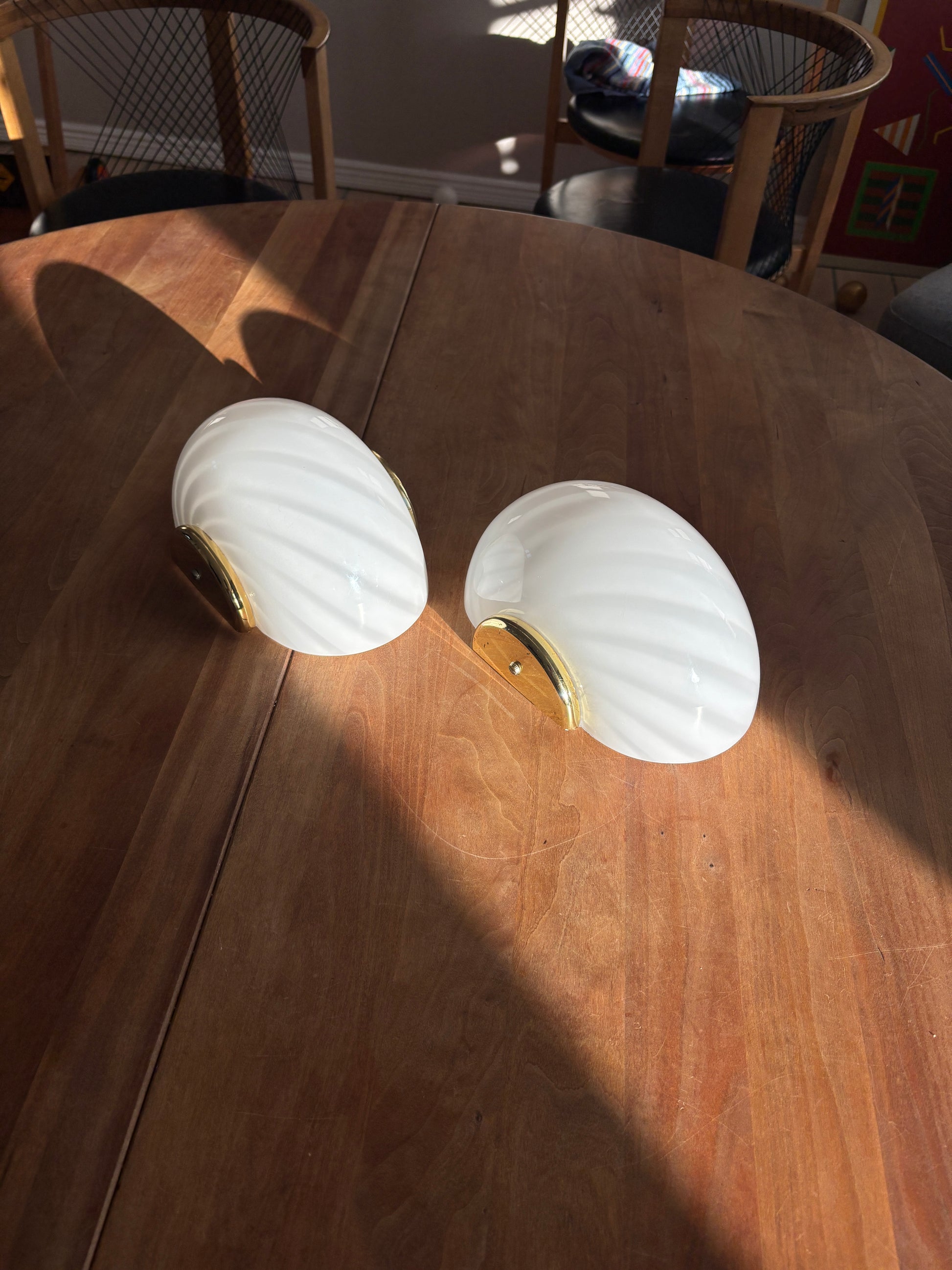 Vintage Murano væglampe i en smuk hvid farve med swirl mønster lampen kommer med messingophæng. Lamperne er i perfekt vintage stand.
