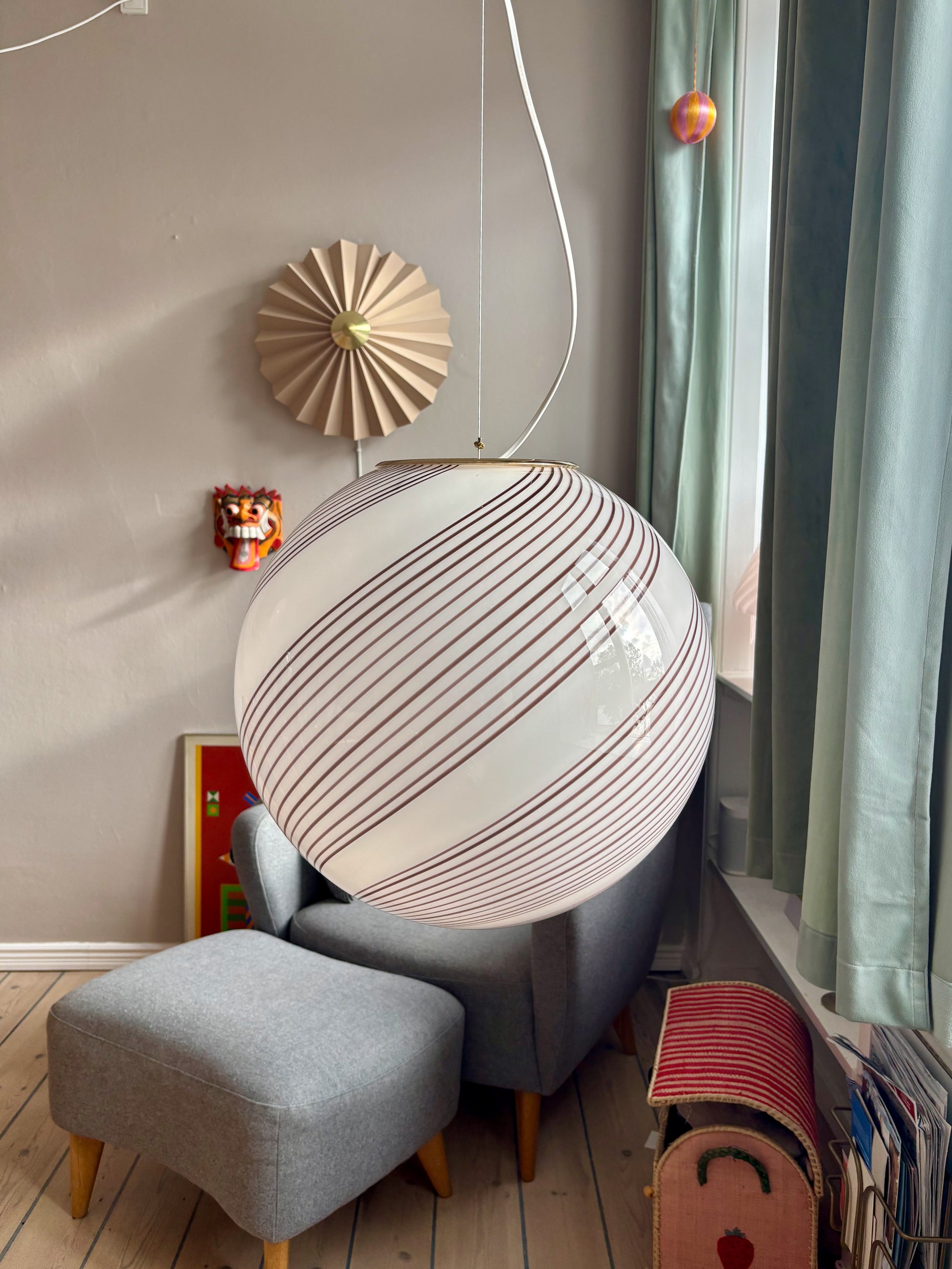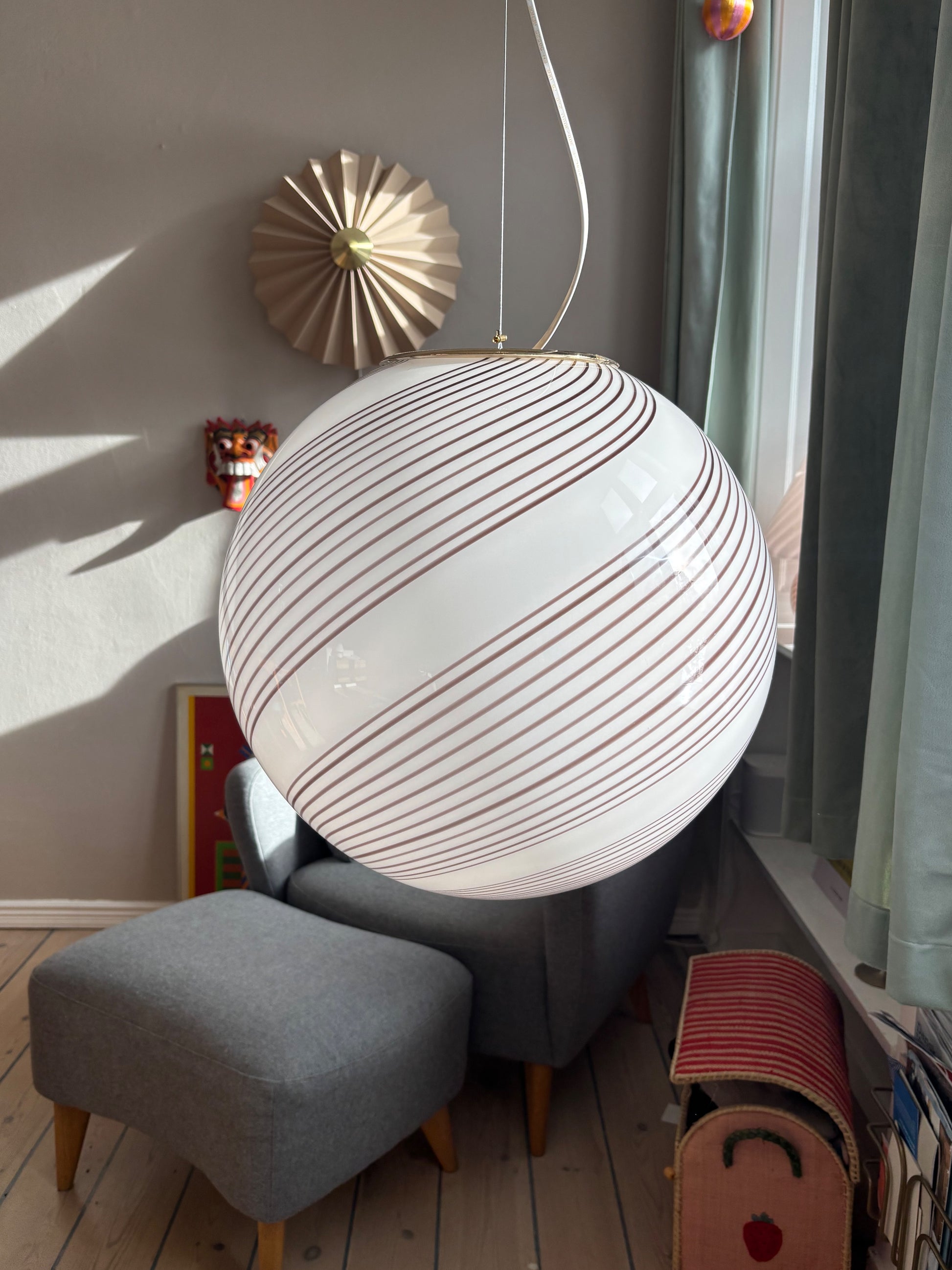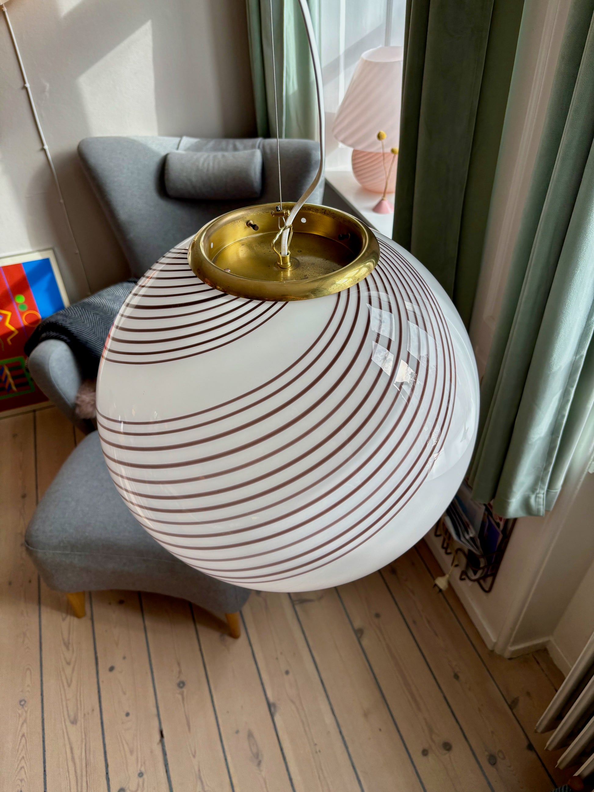 Glasset er mundblæst i en rund form med betagende swirl mønster fra 1970'erne i Italien. Da lampen er håndlavet kan der være små unikke kendetegn ved glasset.