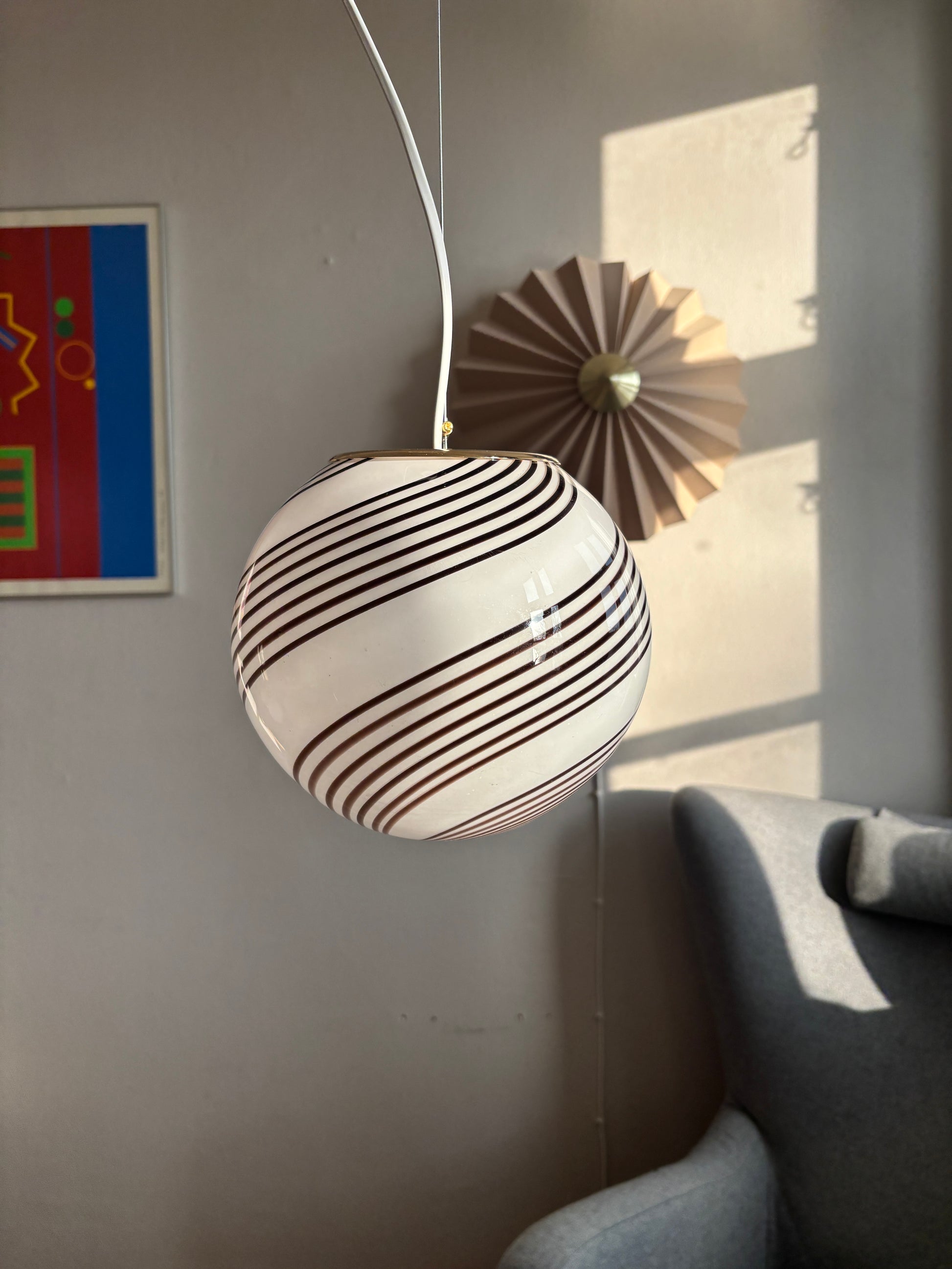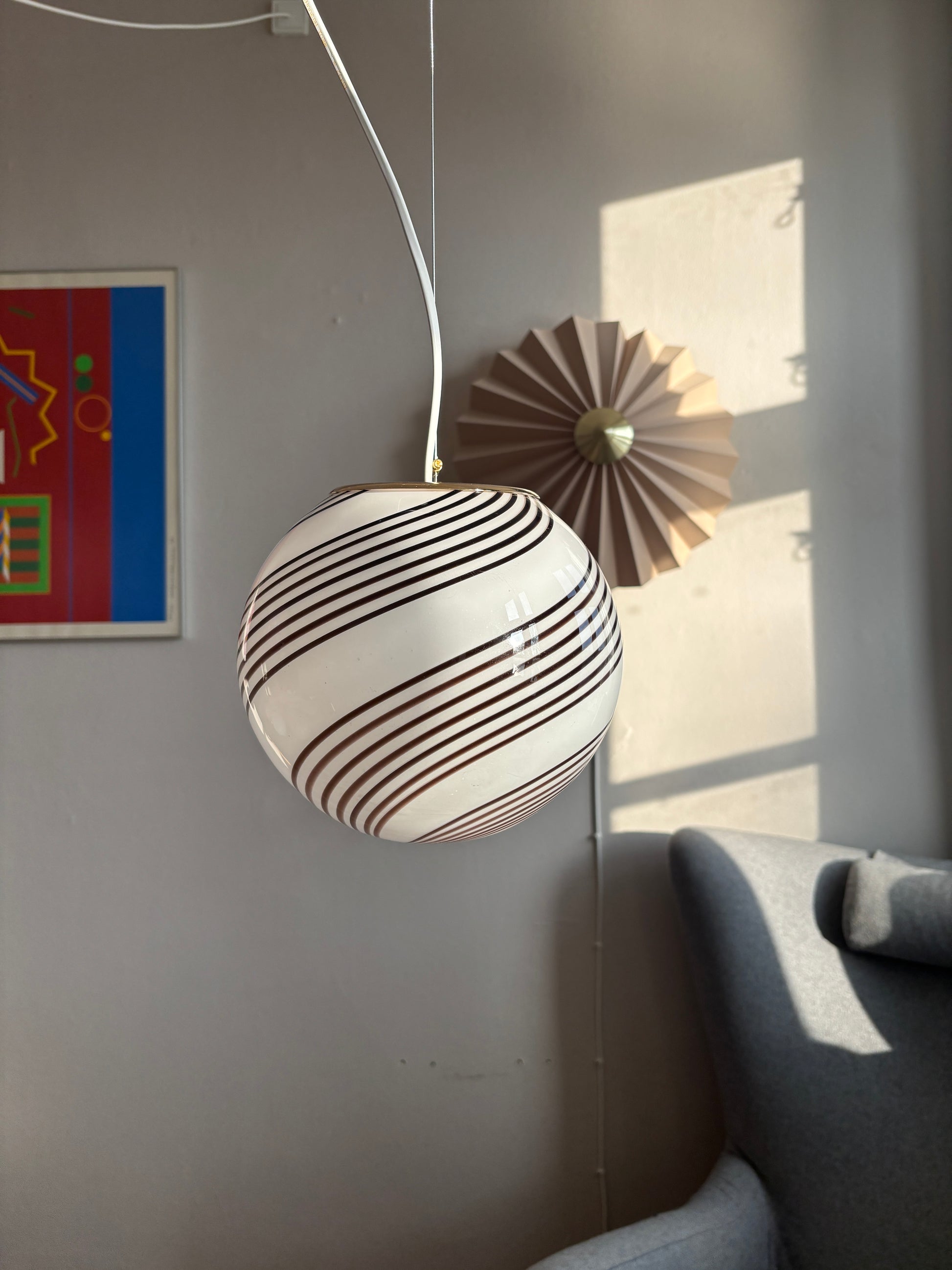 Vintage Murano pendel hvid opalglas med rødbrunt swirl 20 cm