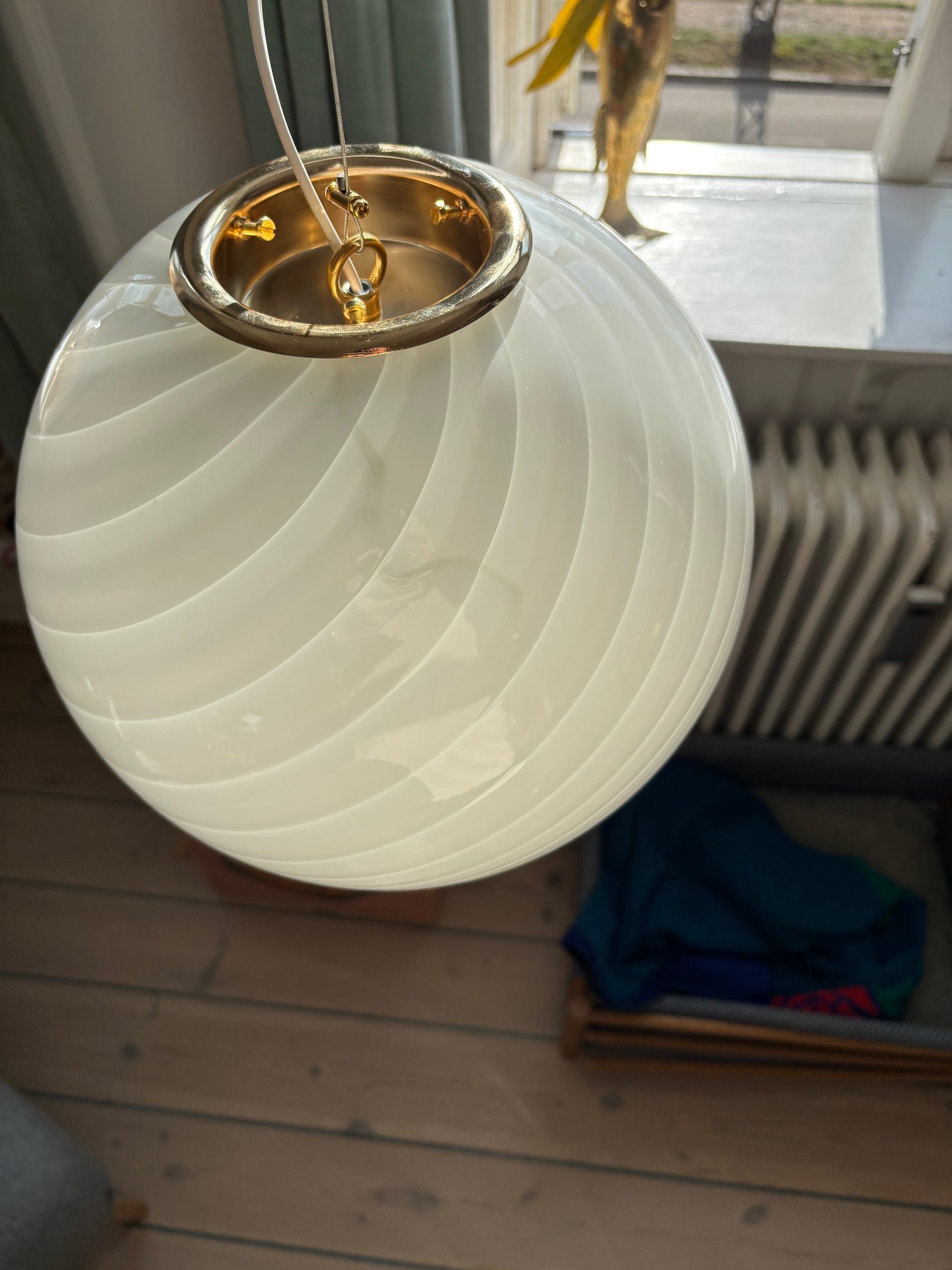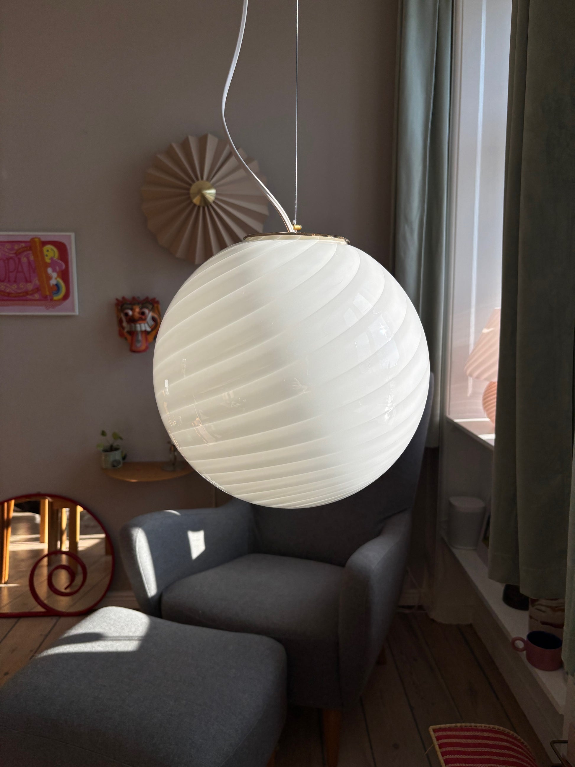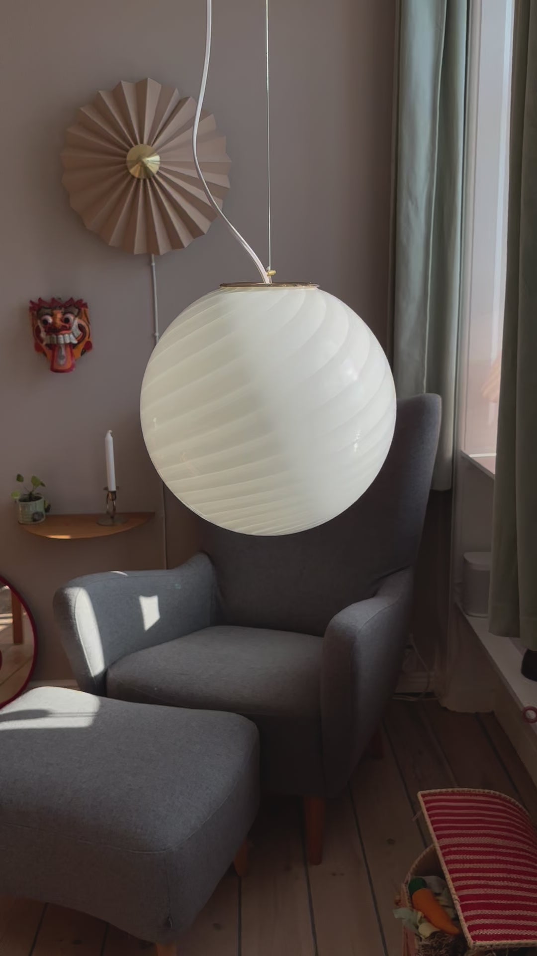 Glasset er mundblæst i en rund form med betagende swirl mønster. Da lampen er håndlavet kan der være små unikke kendetegn ved glasset.
