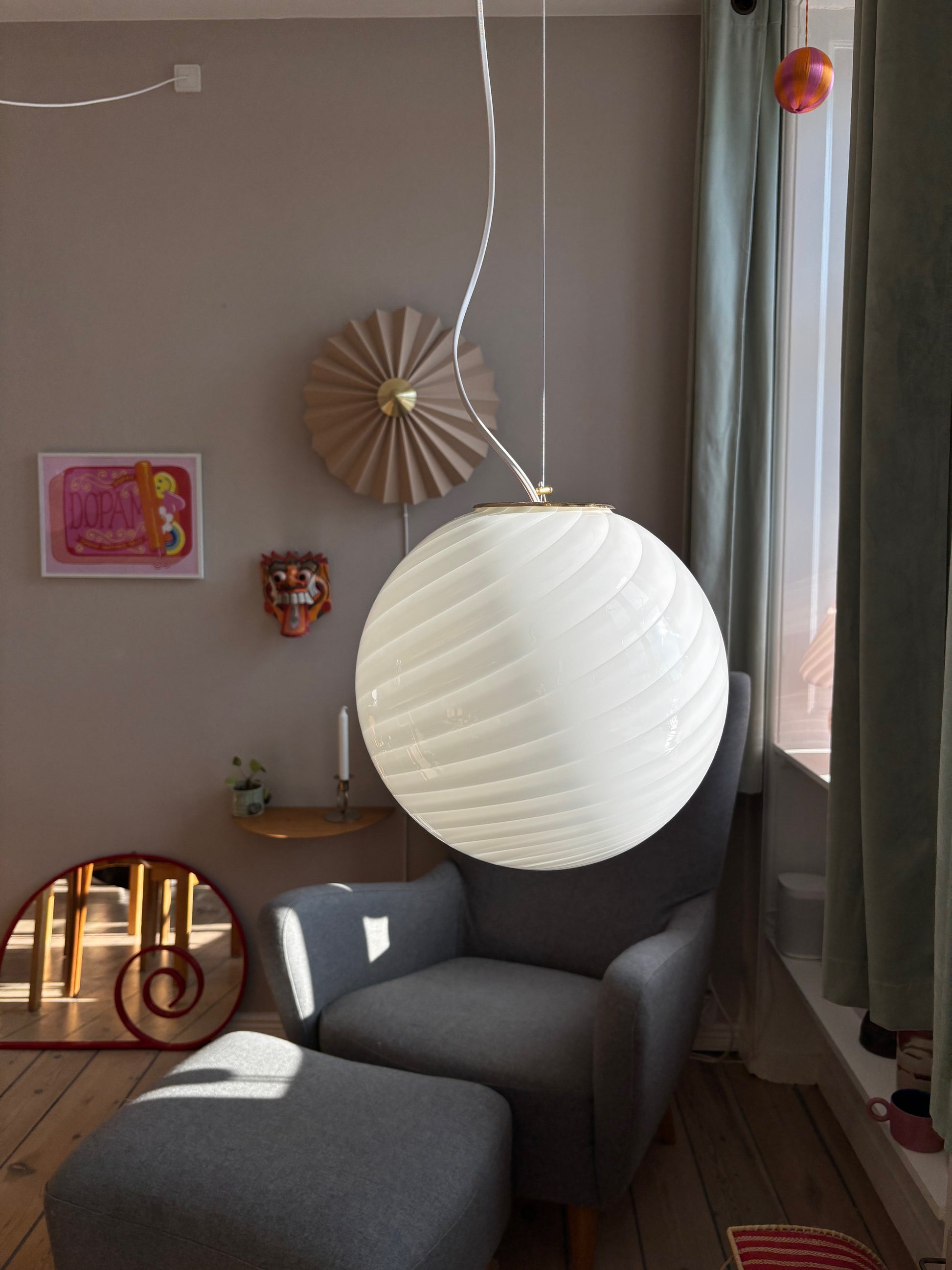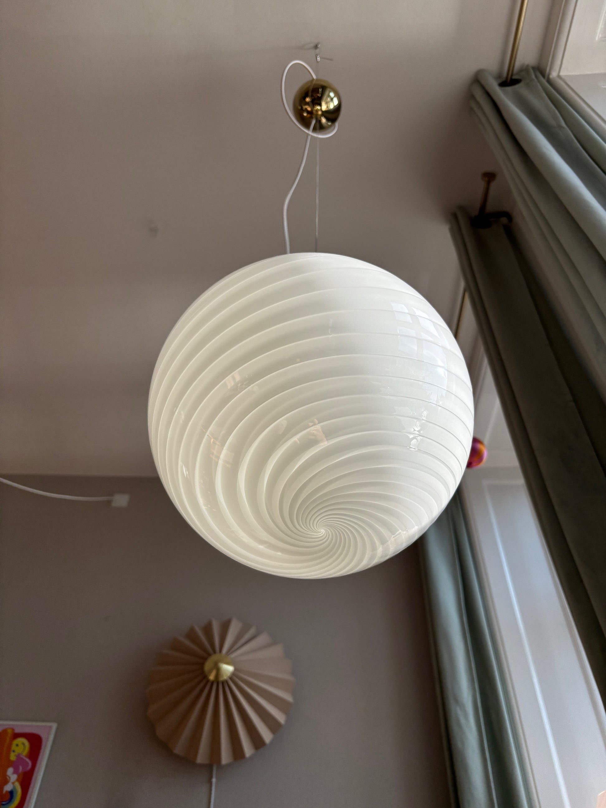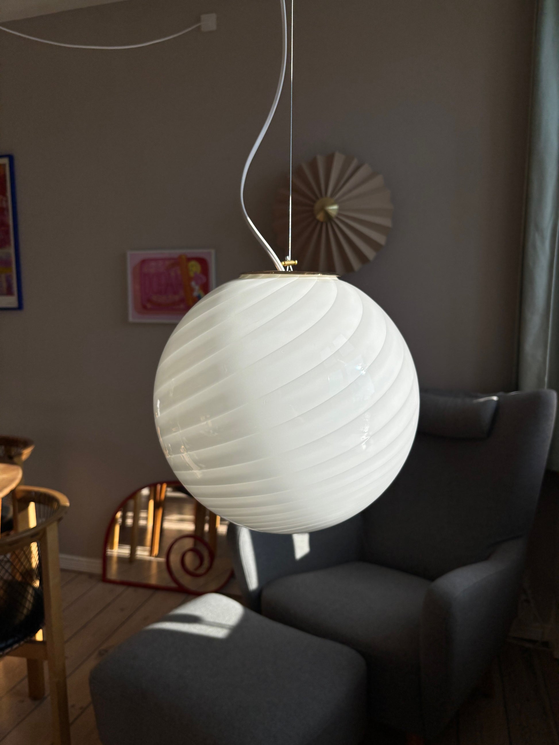 Glasset er mundblæst i en rund form med betagende swirl mønster. Da lampen er håndlavet kan der være små unikke kendetegn ved glasset.