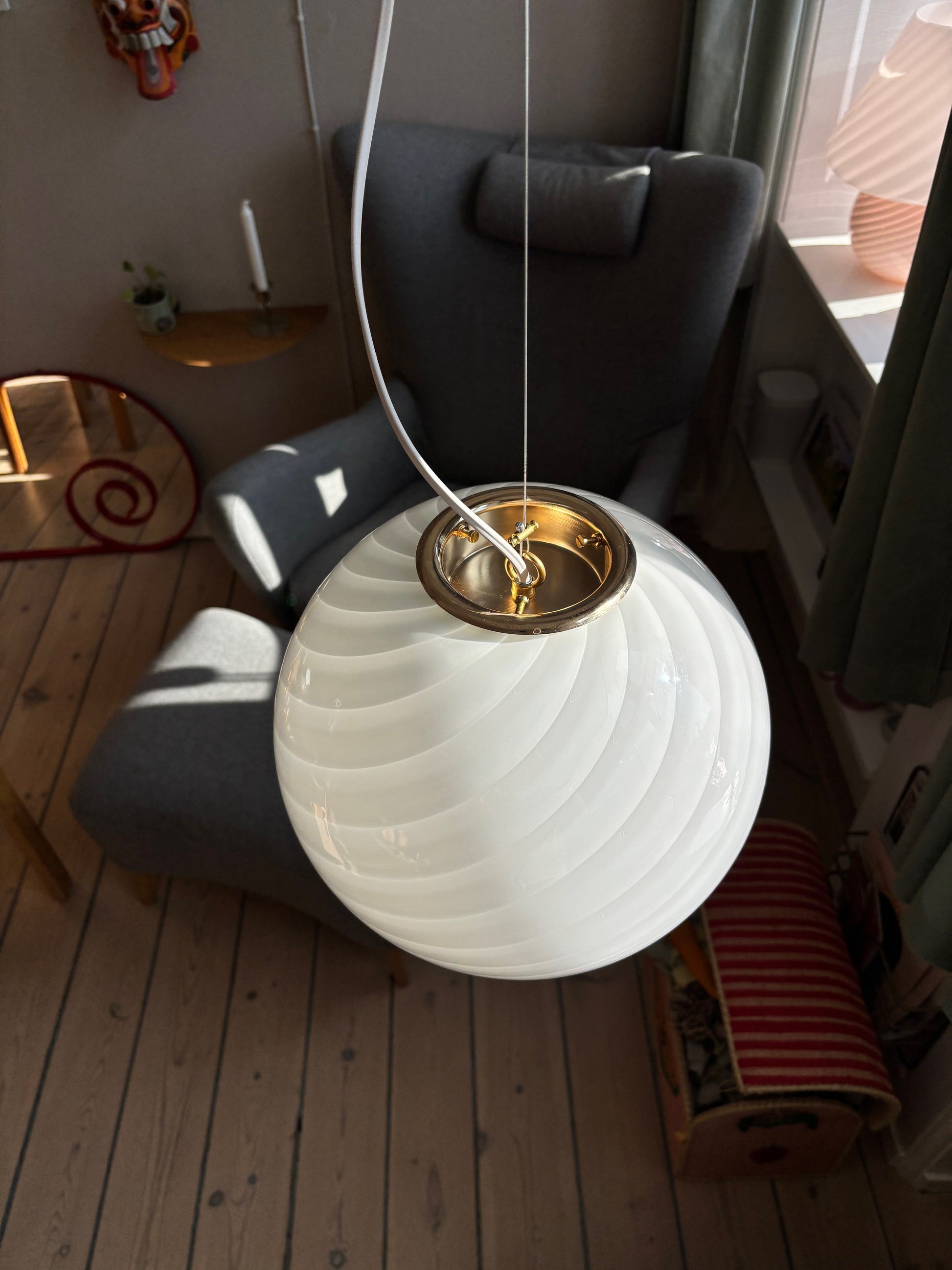 Vintage Murano loftslampe i hvidt swirl med gyldent ophæng.