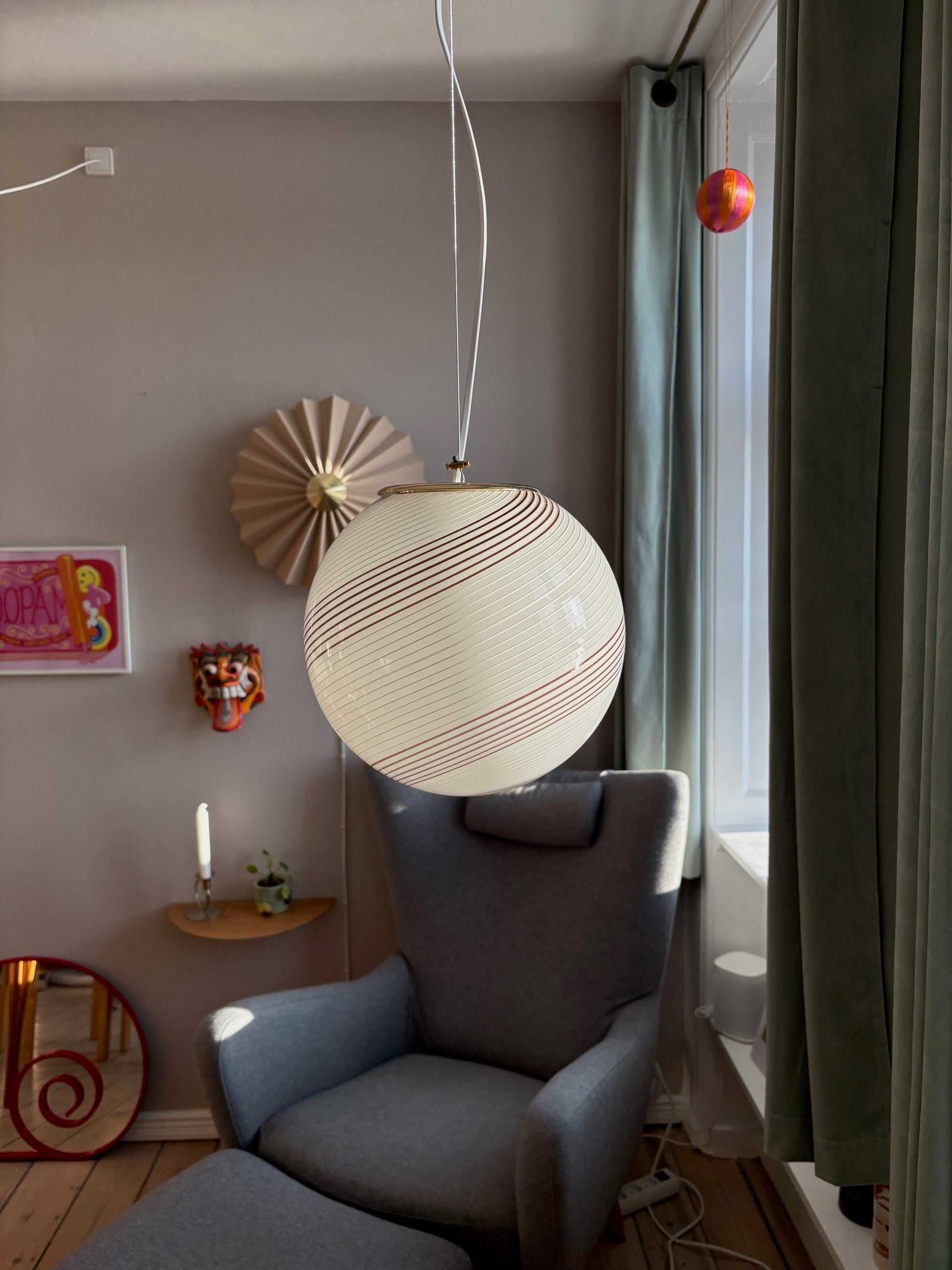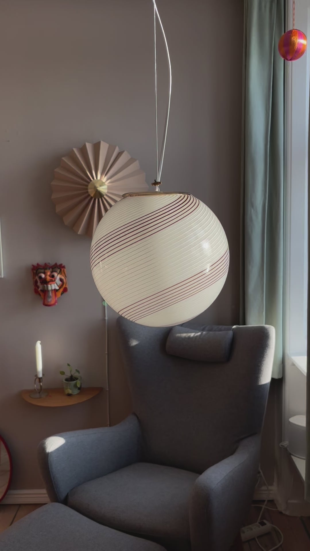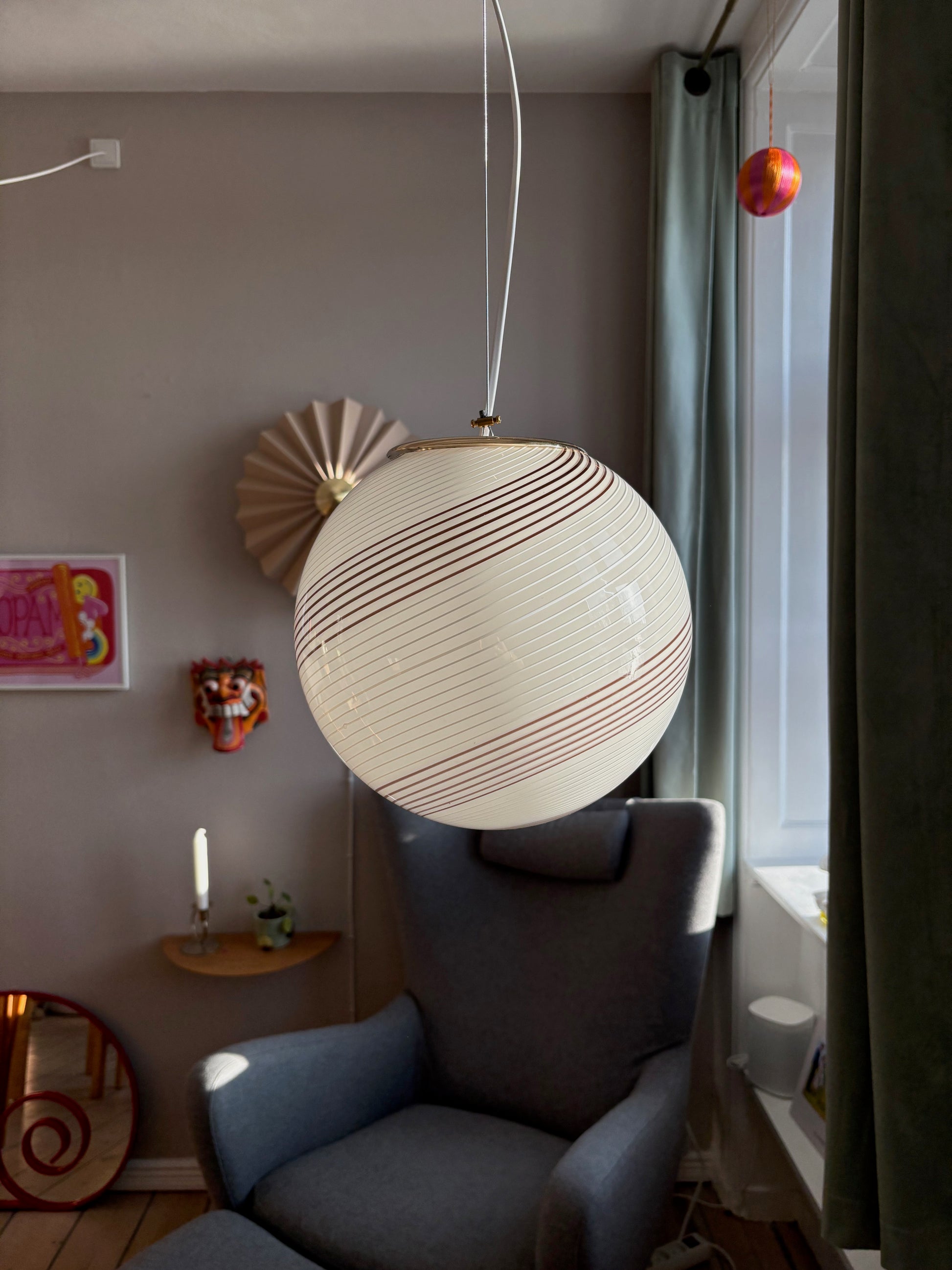 Glasset er mundblæst i en rund form med betagende swirl mønster fra 1970'erne i Itailain. Da lampen er håndlavet kan der være små unikke kendetegn ved glasset.