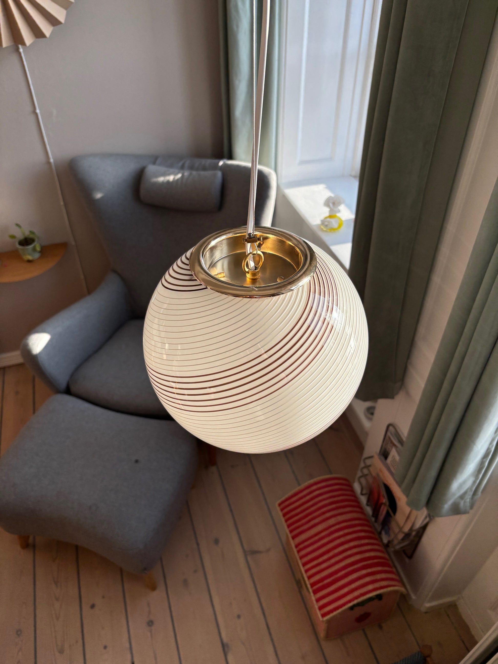 Vintage Murano pendel i hvidt og rødt swirl 25 cm