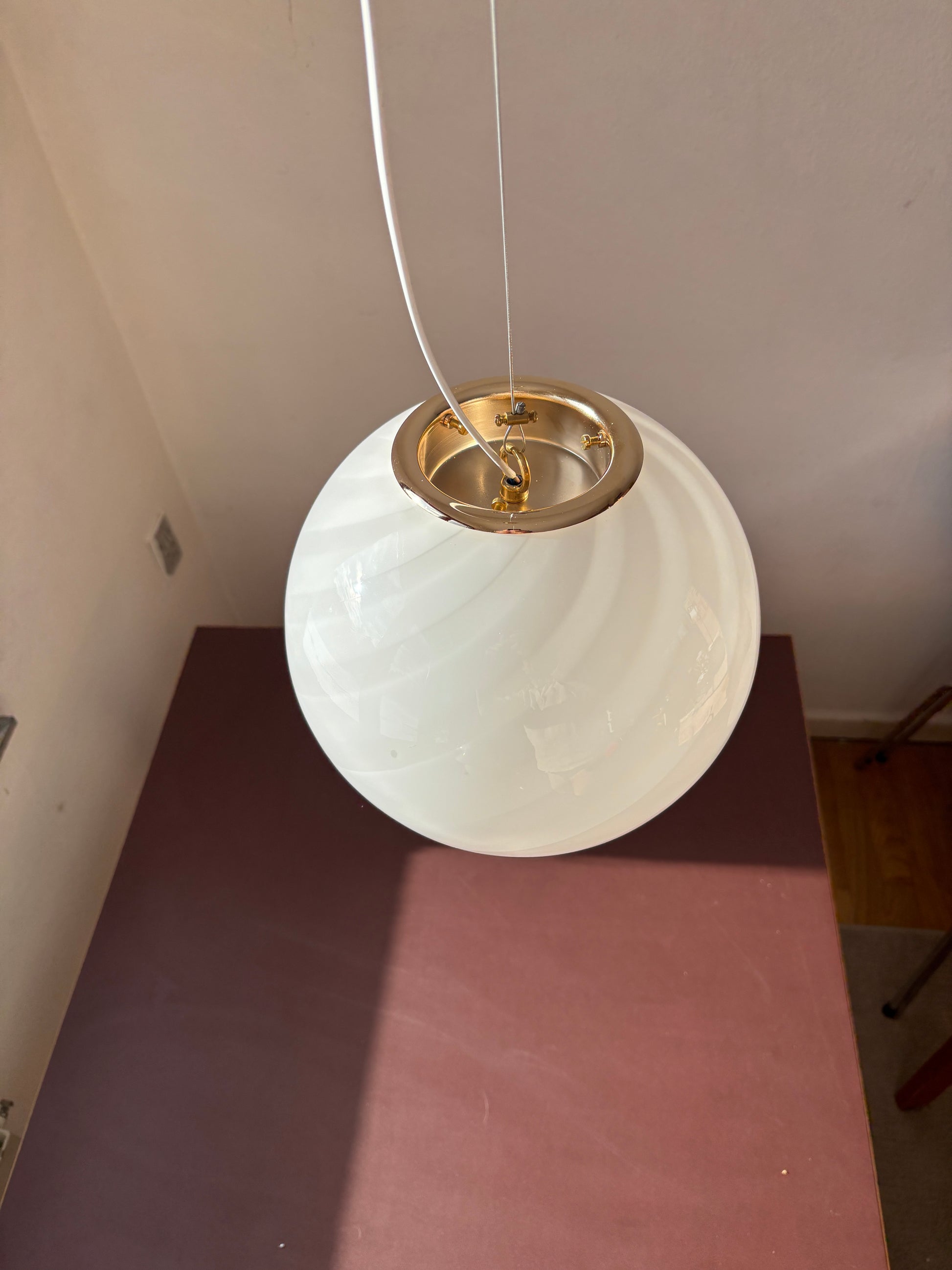 Vintage Murano loftslampe med et skønt hvidt swirl, kommer med et gyldent ophæng.