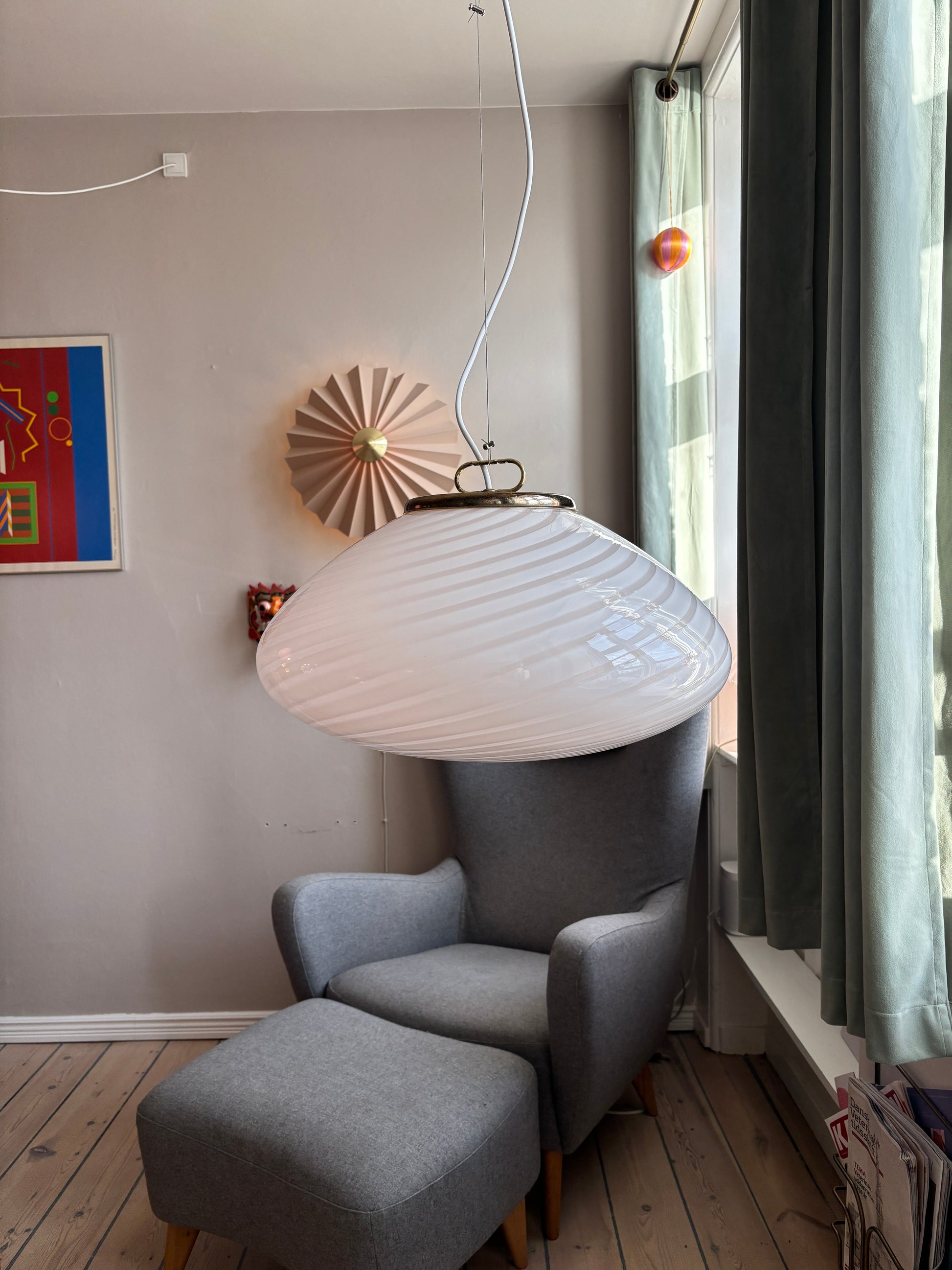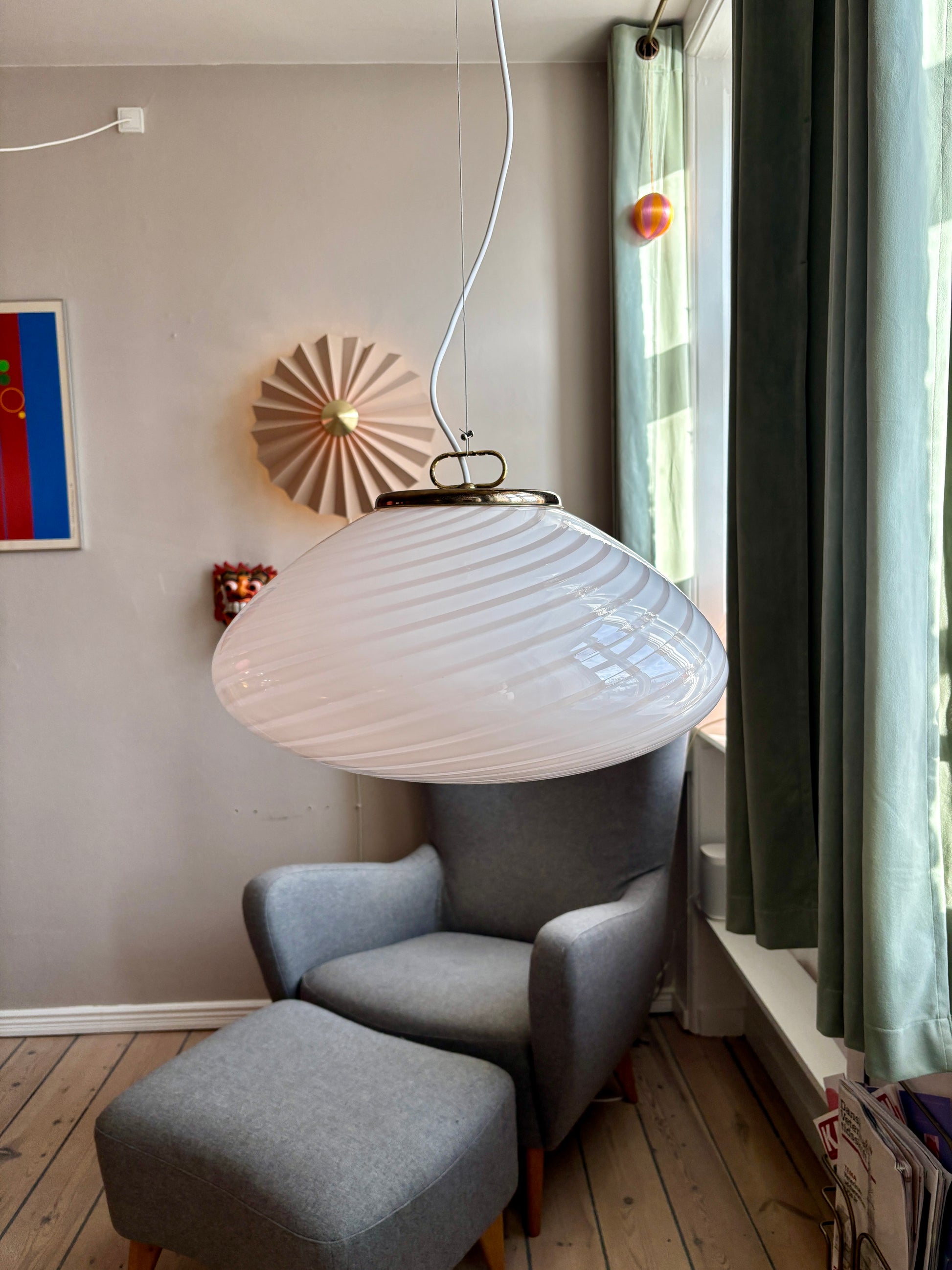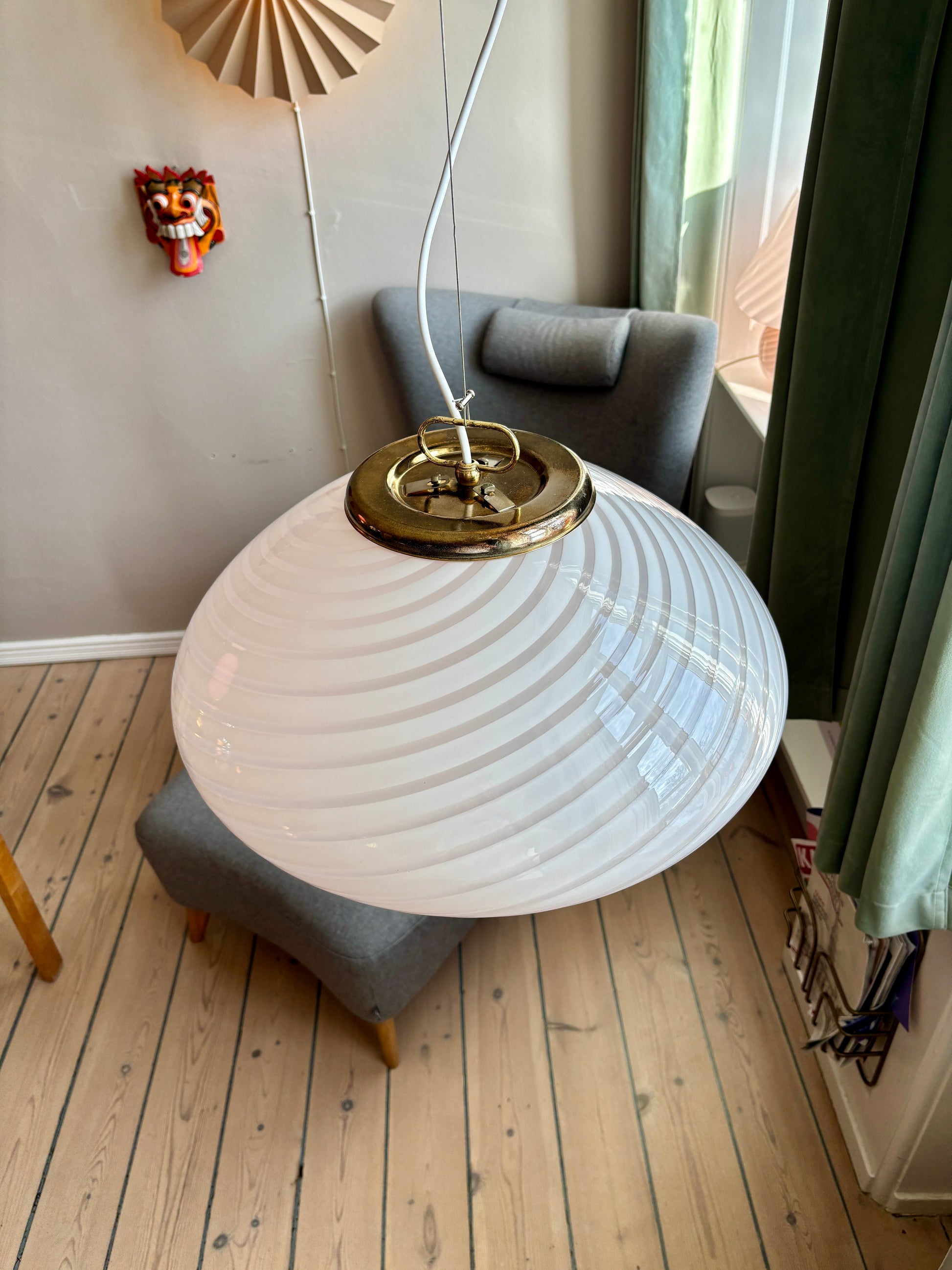 Lampen er enorm smuk i sit swirl. Glasset er mundblæst i en betagende oval form med swirl mønster. Da lampen er håndlavet kan der være små unikke kendetegn og uregelmæssigheder ved glasset.
