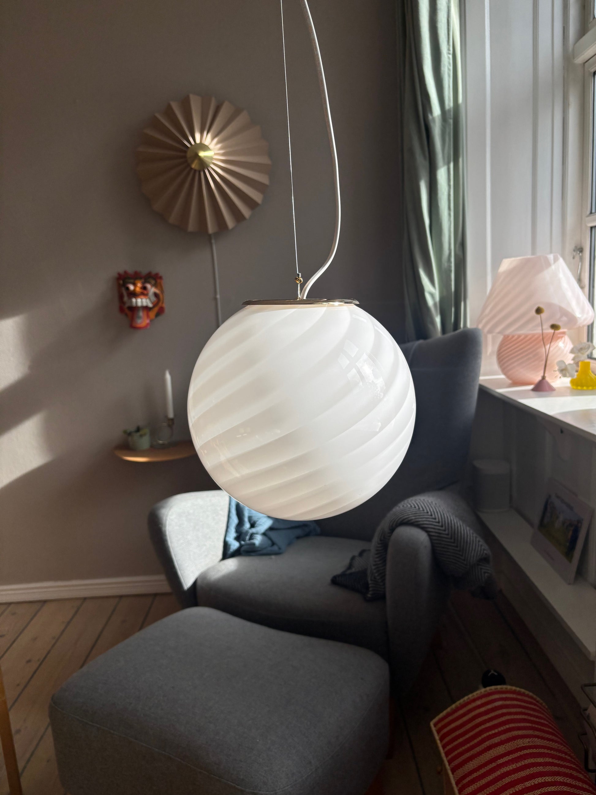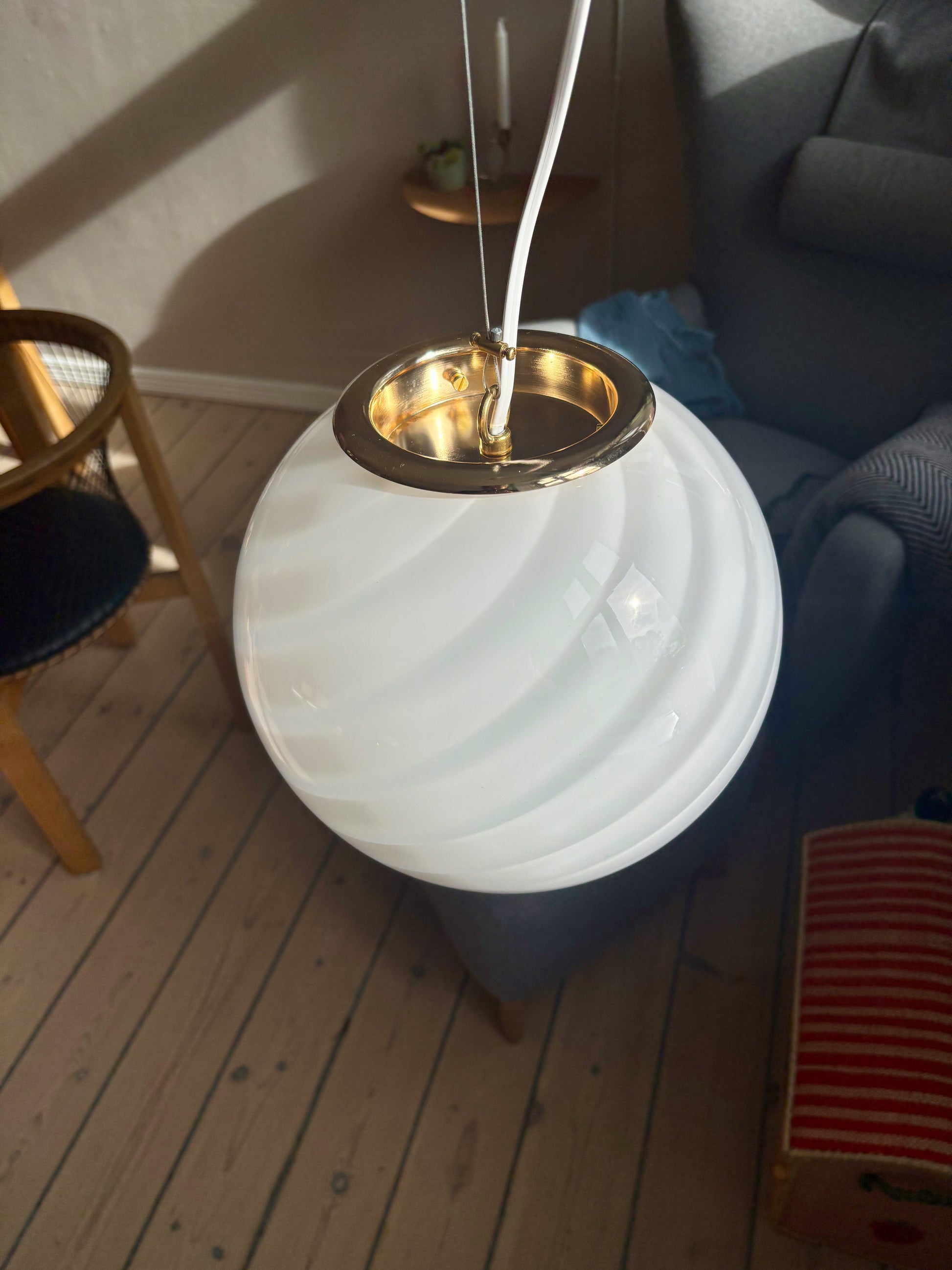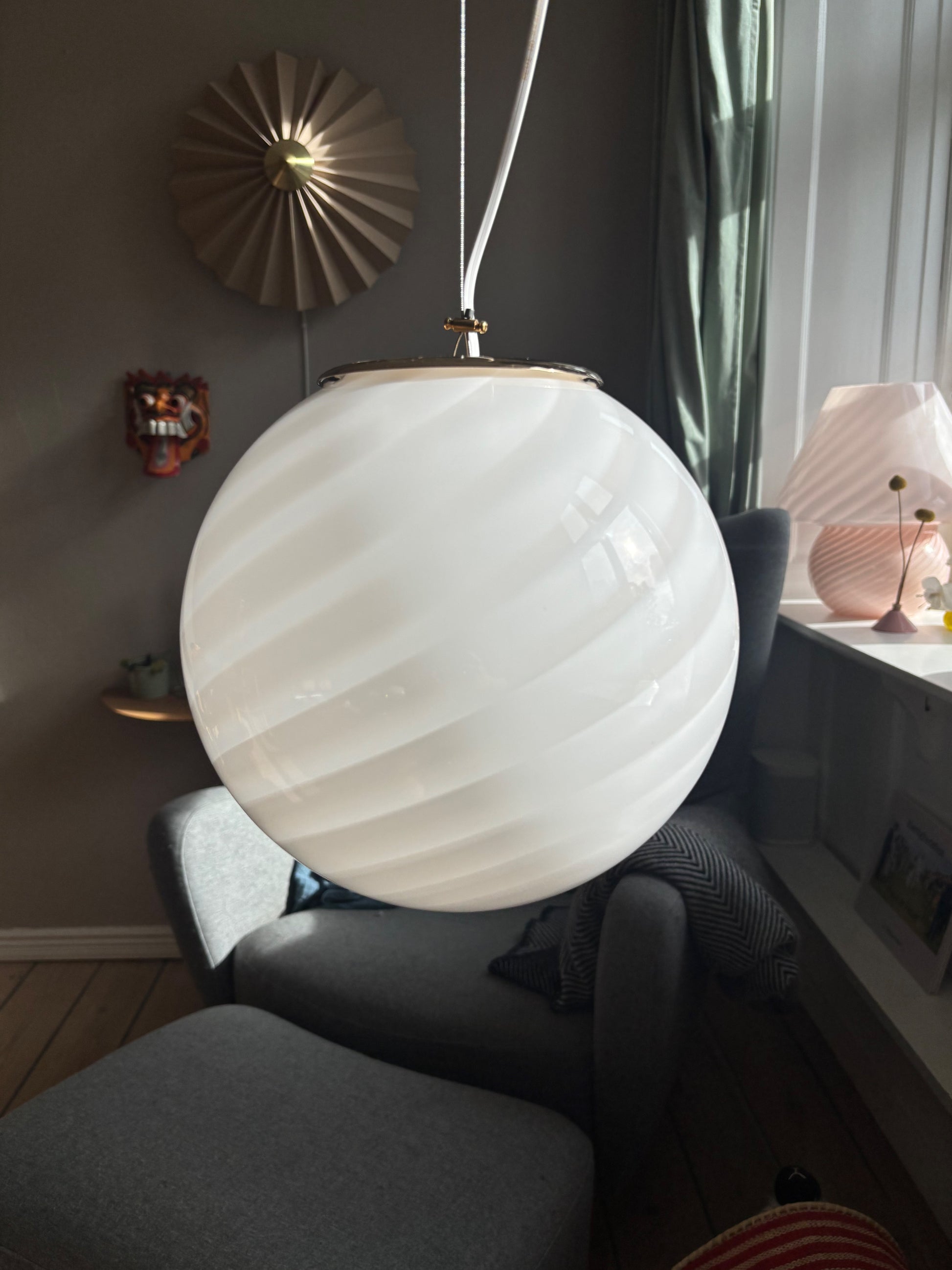 Vintage Murano pendel rund med hvidt swirl 25 cm