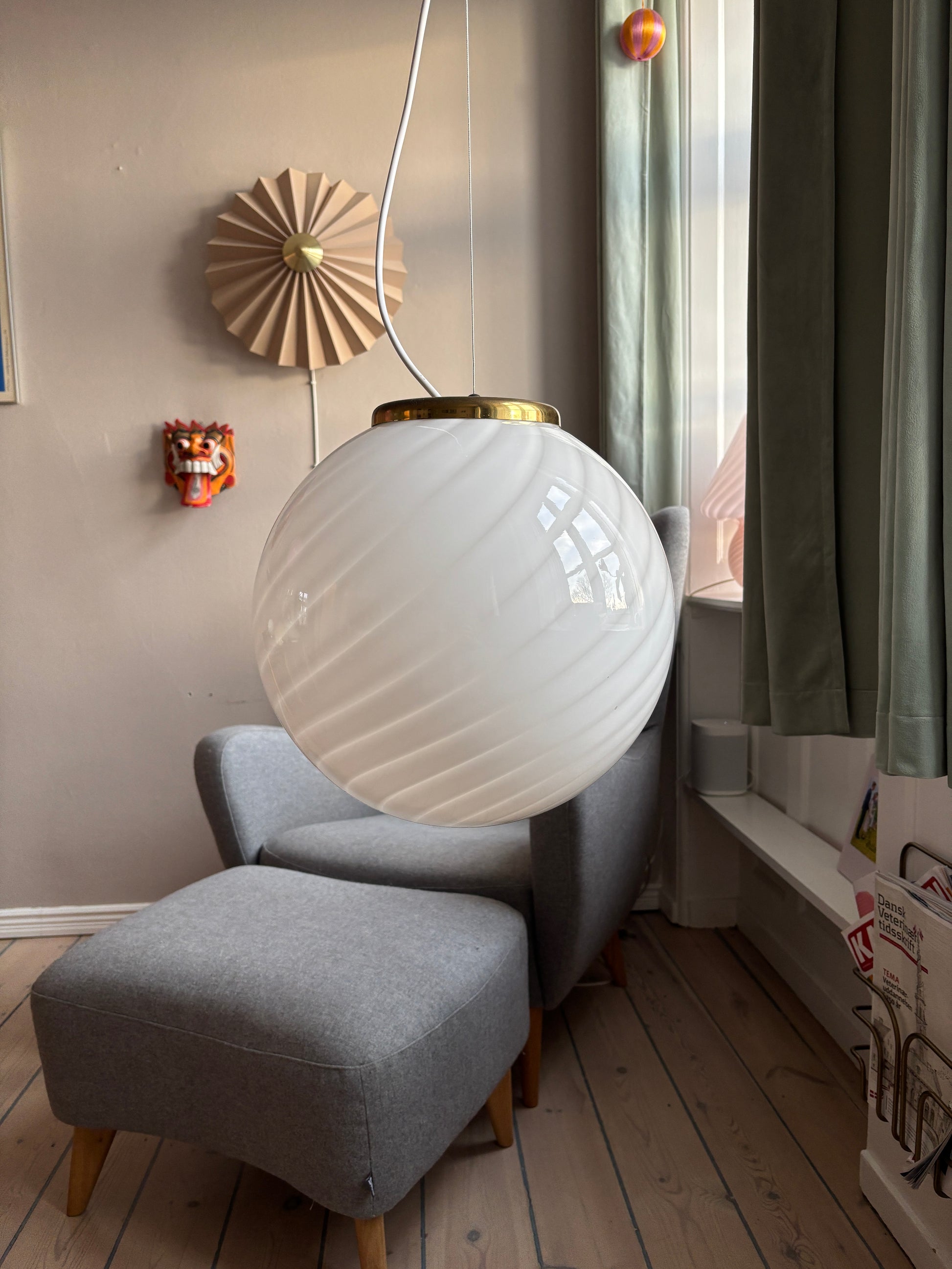 Vintage Murano loftslampe i hvid swirl med messing ophæng. Lampen er enorm smuk i sit swirl og kommer med originalt Murano klistermærke og stammer fra Vetreria Lag S.R.L