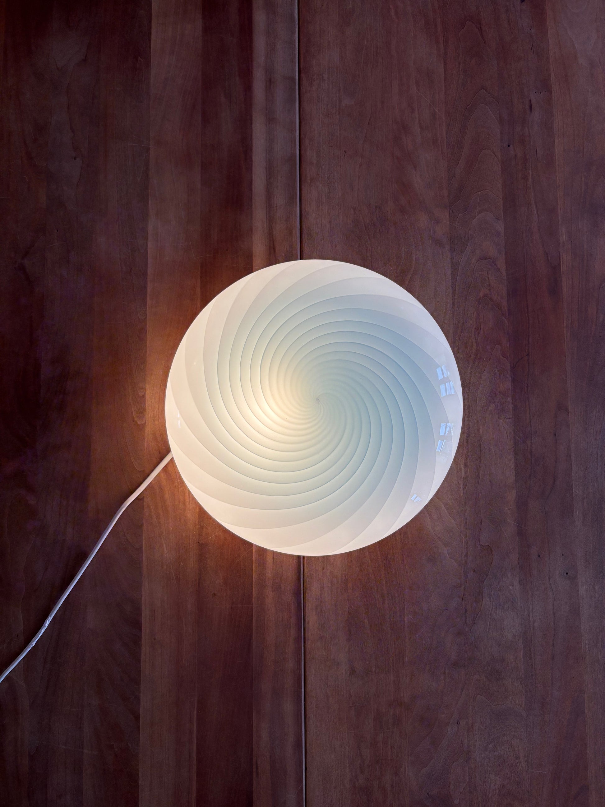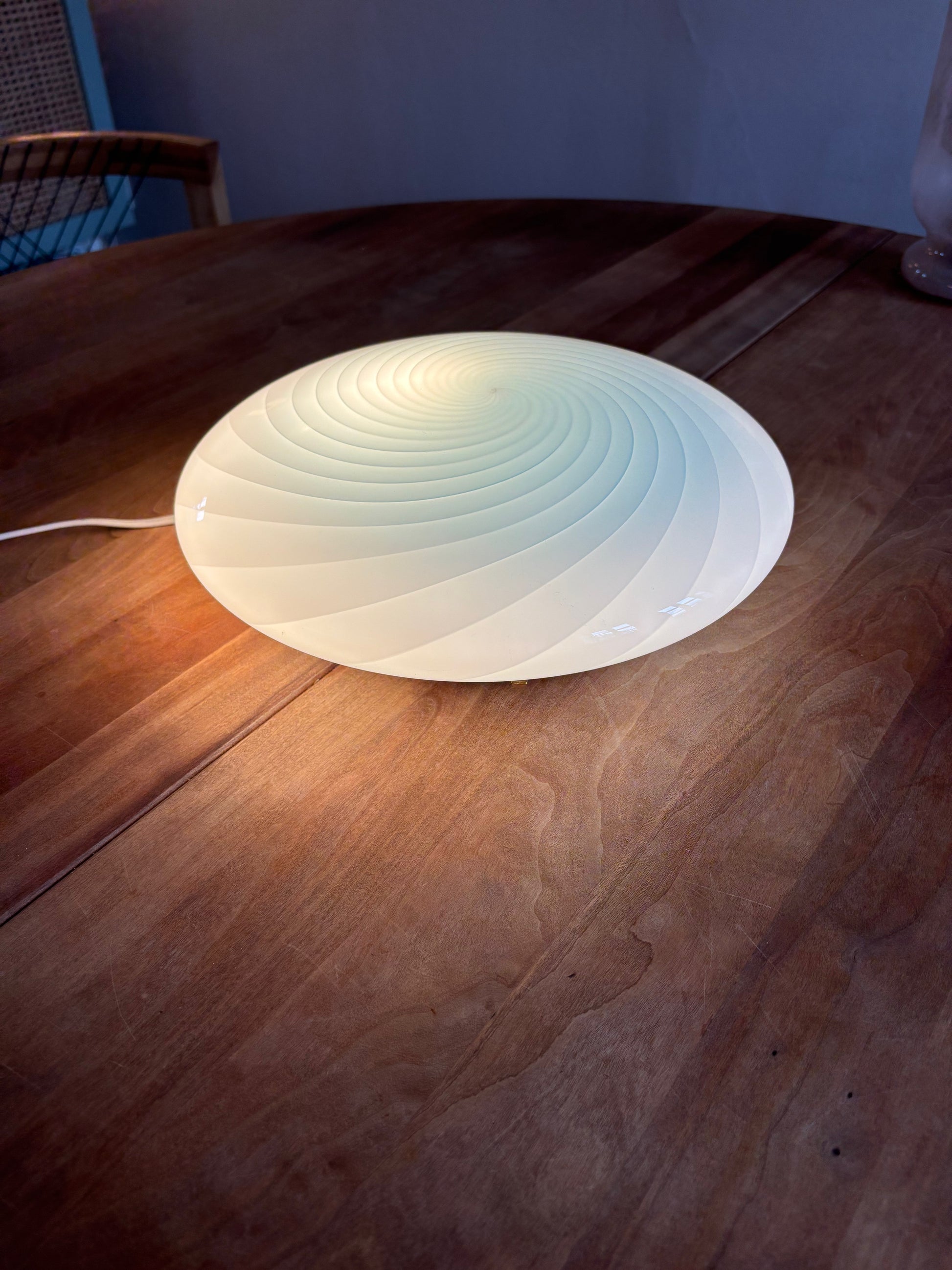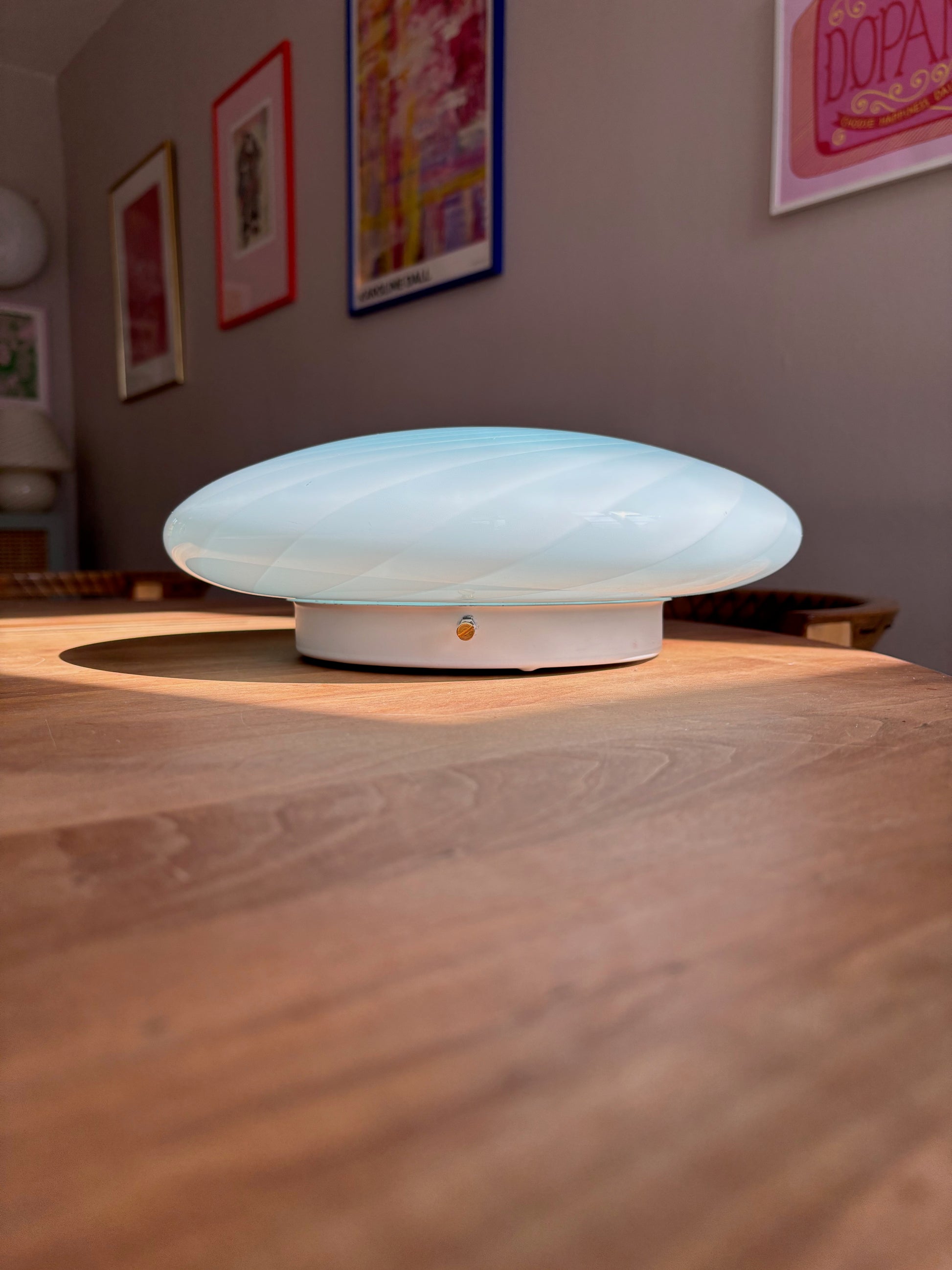 Vintage Murano plafond lampe i glas med lyseblåt swirl mønster. Kan både bruges som loftlampe eller som væglampe. Håndlavet i Italien, 1970erne og mundblæst i Murano glas.