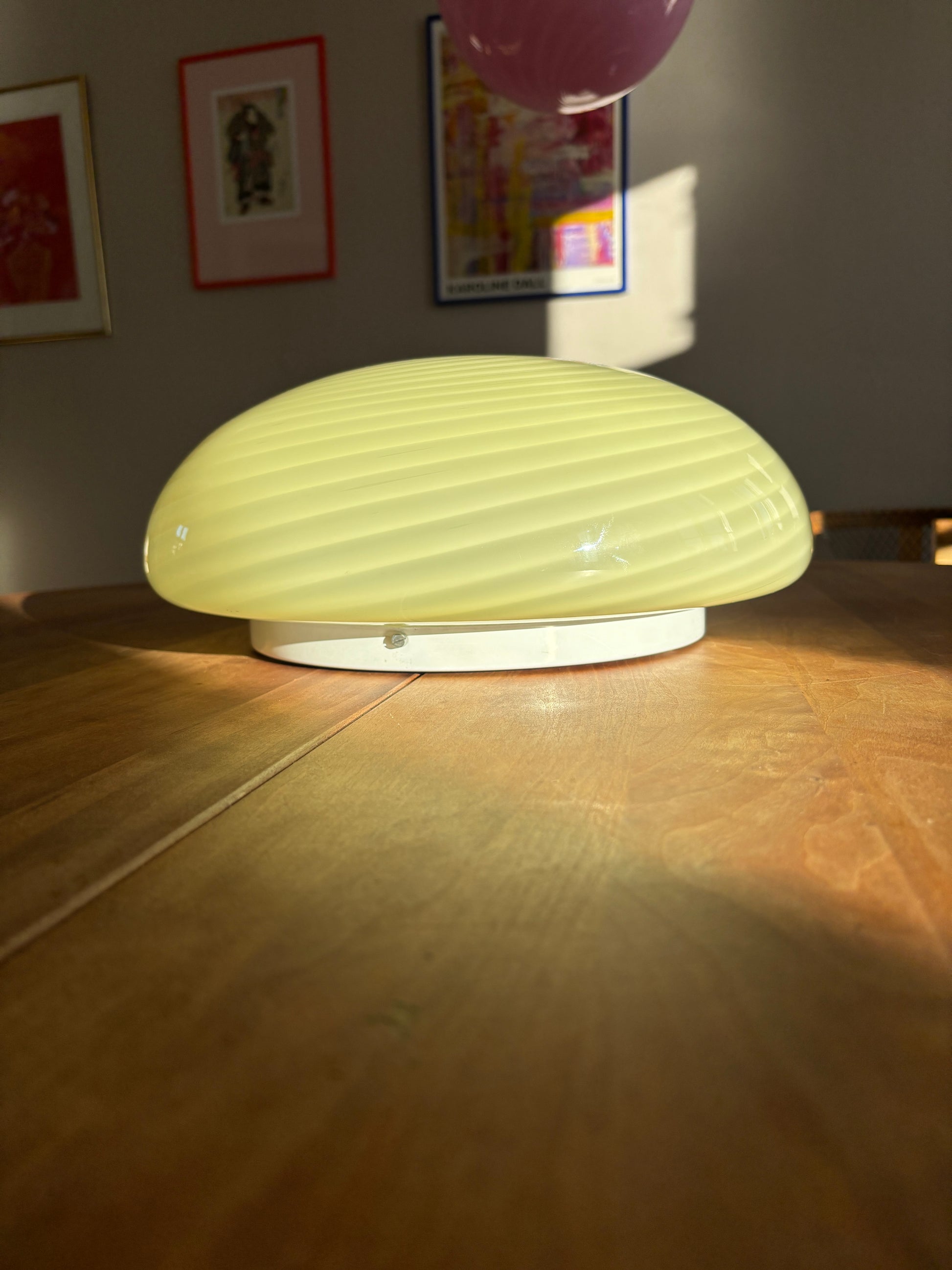 Murano loftslampe i gul med swirl med hvidt ophæng. Lampen er enorm smuk i sit swirl. Glasset er mundblæst med et betagende swirl mønster. Da lampen er håndlavet kan der være små unikke kendetegn ved glasset.