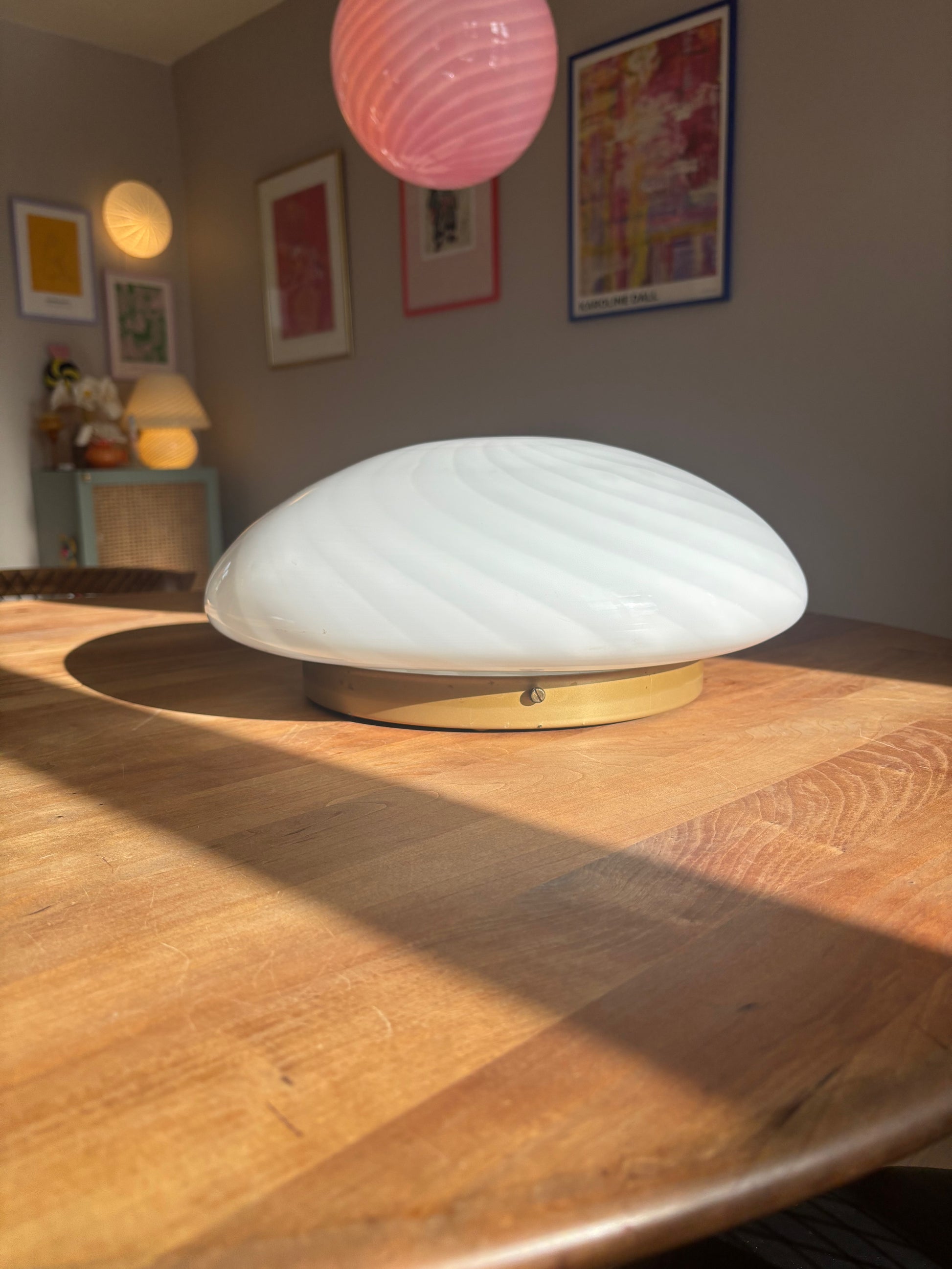 Vintage Murano plafond lampe i glas med hvidt swirl mønster og lampen kommer med et smukt messing ophæng.