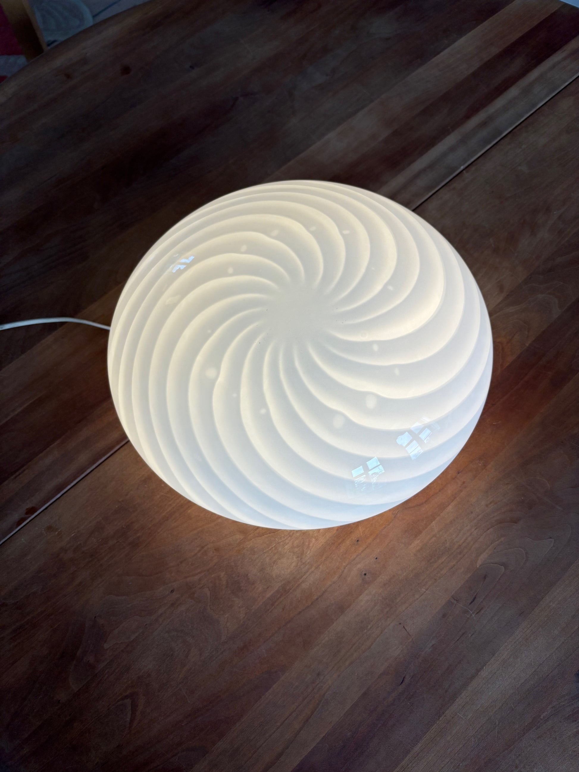 Lampen er i perfekt vintage stand, men hver opmærksom på luftboblerne, som er en naturlig del af processen ved håndlavet glas. Der er dog opstået mange hos denne lampe, som gør den unik, men også billigere.
