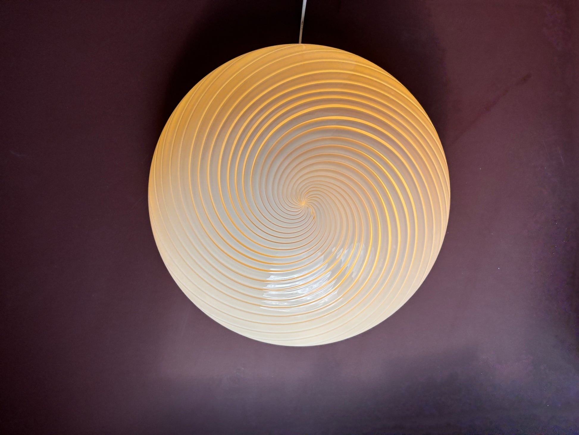 Sjælden vintage Murano plafond lampe i cremegult muranoglas med swirl mønster og lampen kommer med et smukt hvidt ophæng.