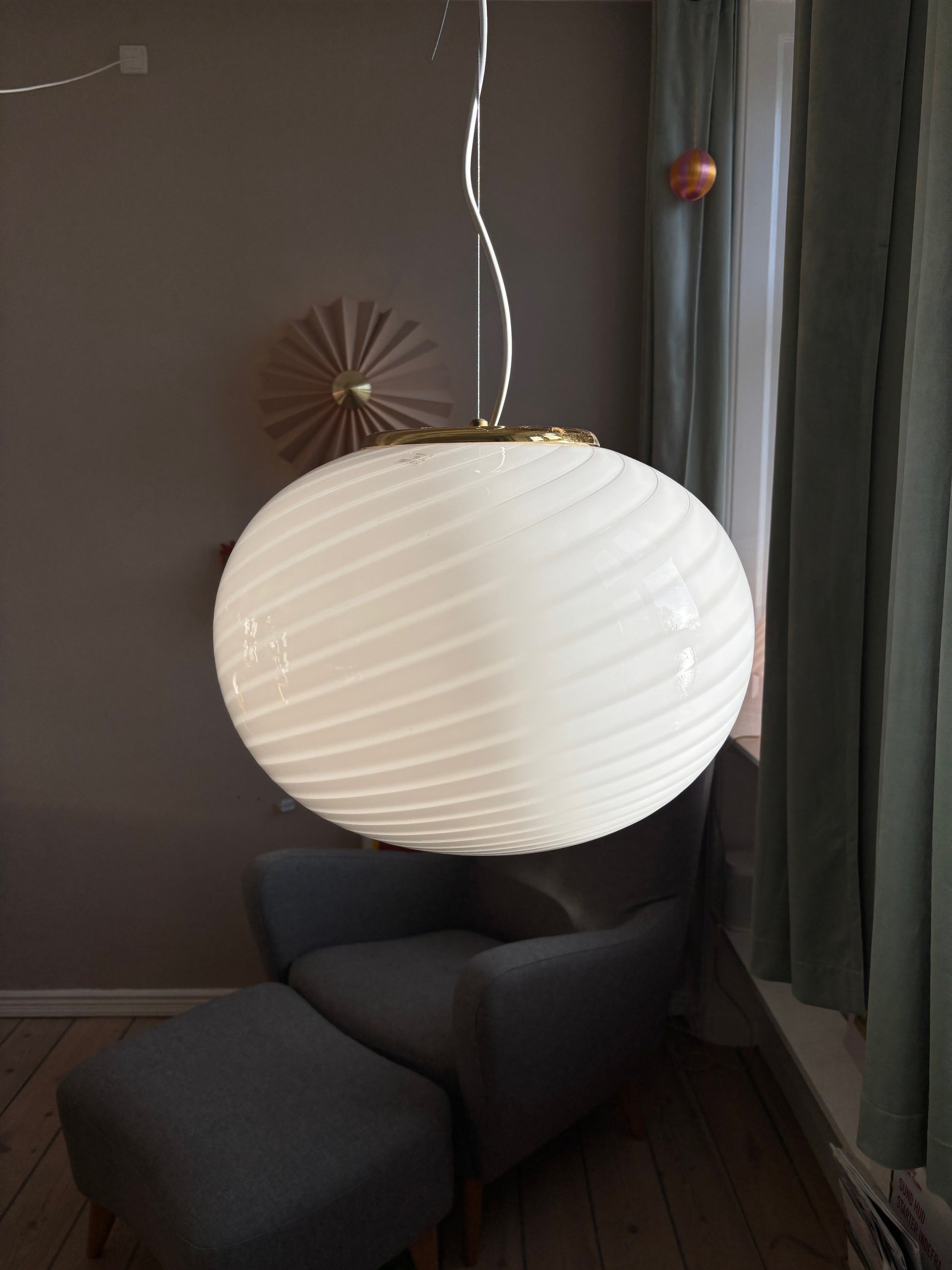 Glasset er mundblæst i en oval form med betagende swirl mønster. Da lampen er håndlavet kan der være små unikke kendetegn ved glasset.
