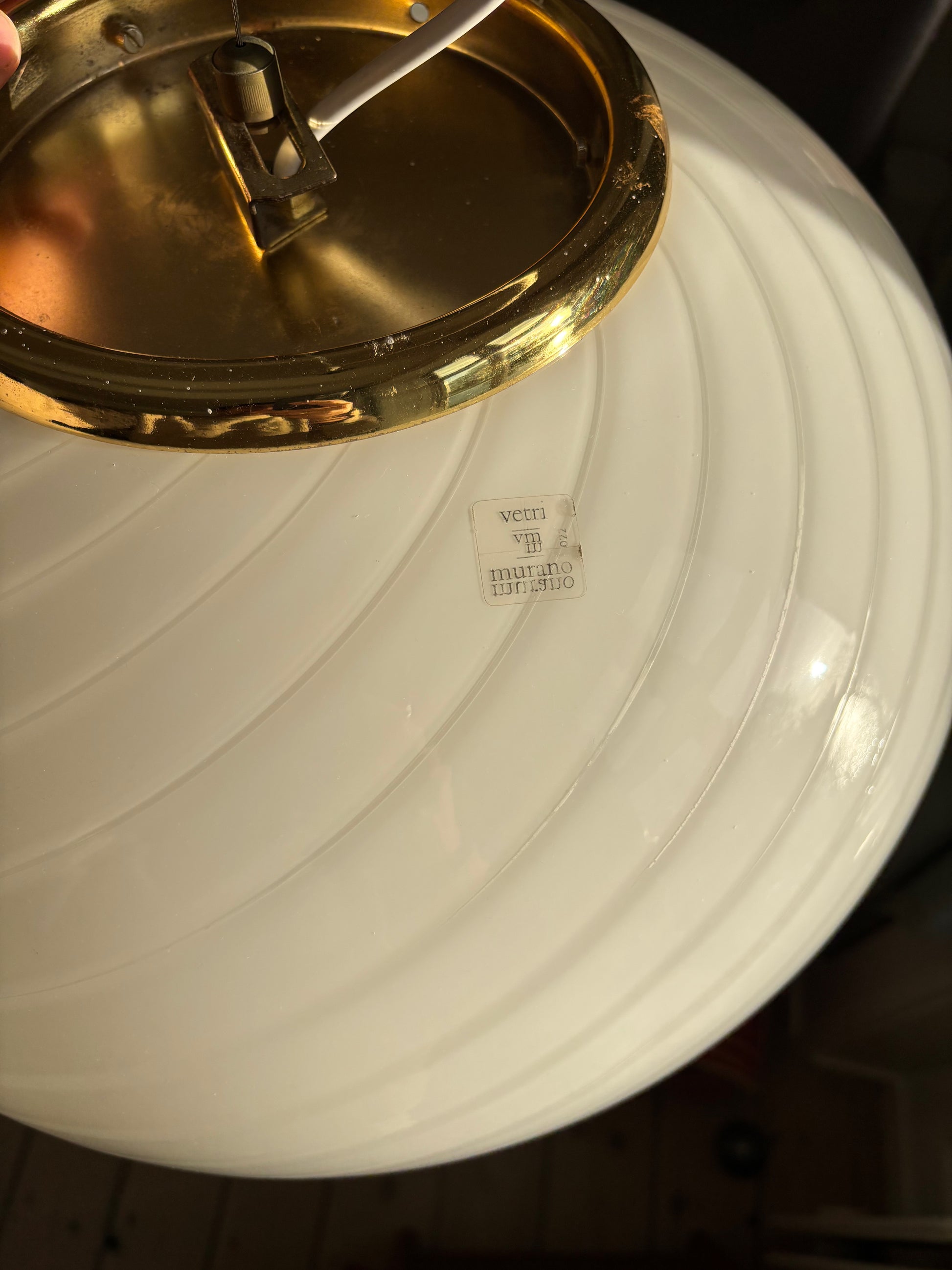 Vintage Murano loftslampe i hvid swirl med messing ophæng. Lampen er enorm smuk i sit swirl og kommer med originalt Murano klistermærke og stammer fra Effetre.