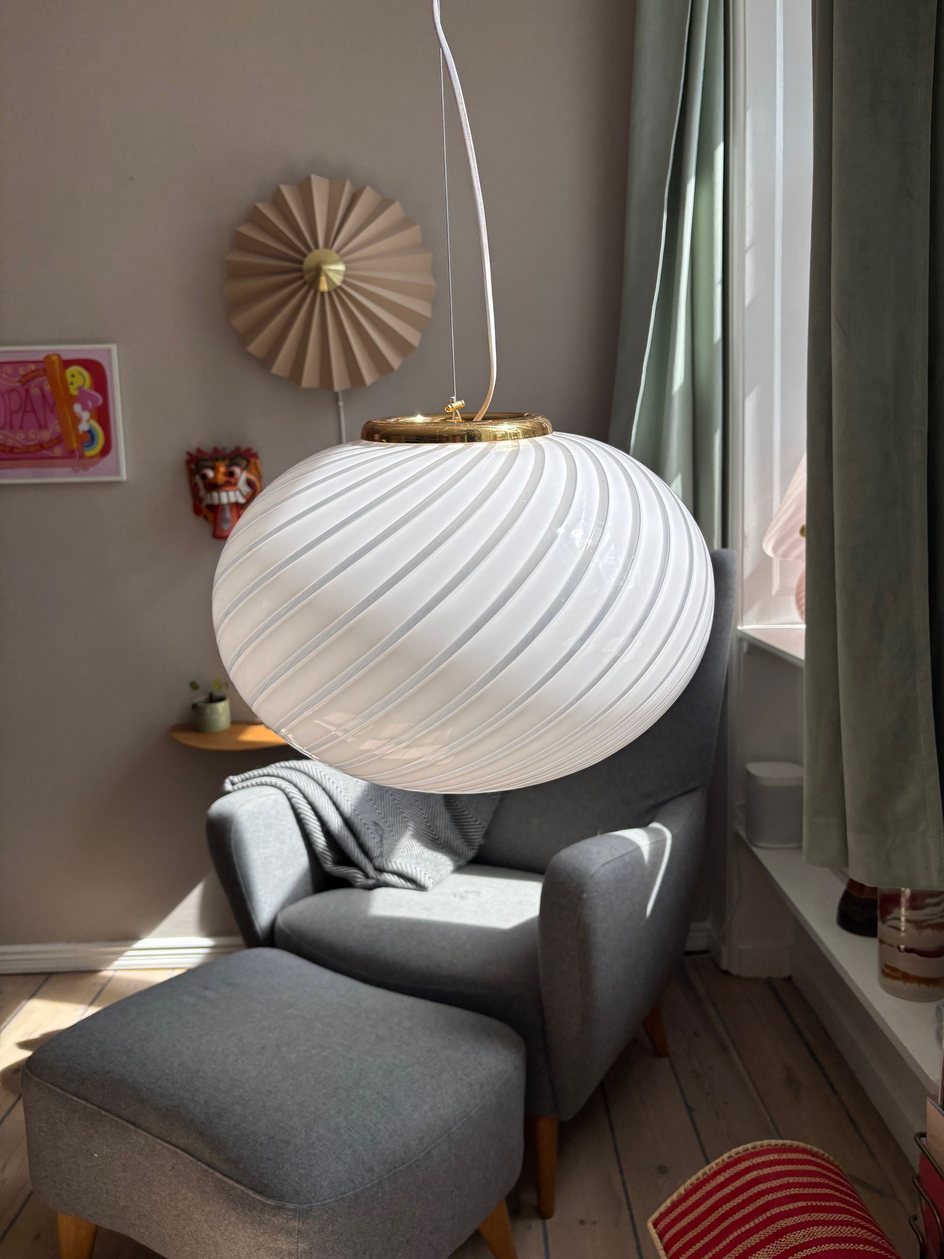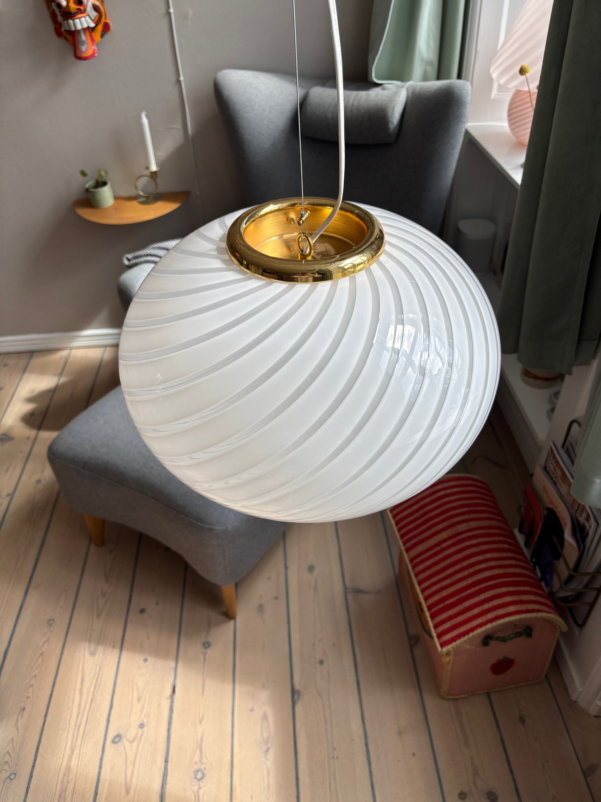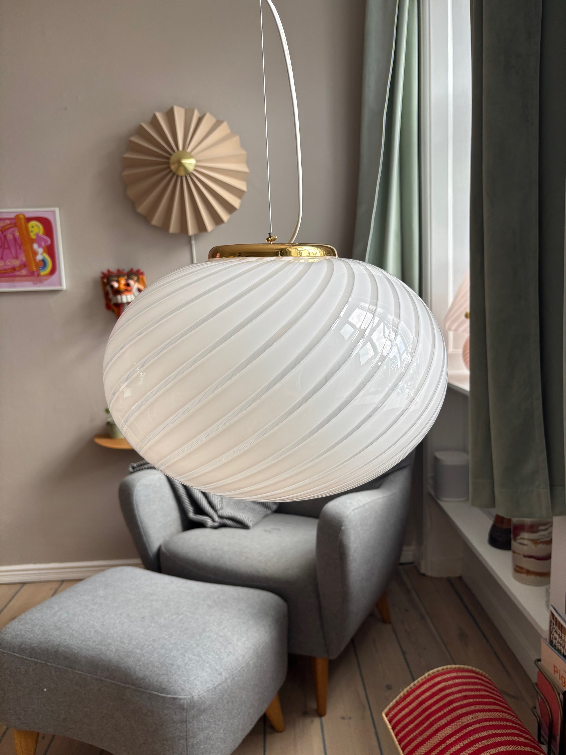 intage Murano loftslampe i hvid swirl med gyldent ophæng. Lampen er enorm smuk i sit swirl. Glasset er mundblæst i en oval form med betagende swirl mønster.