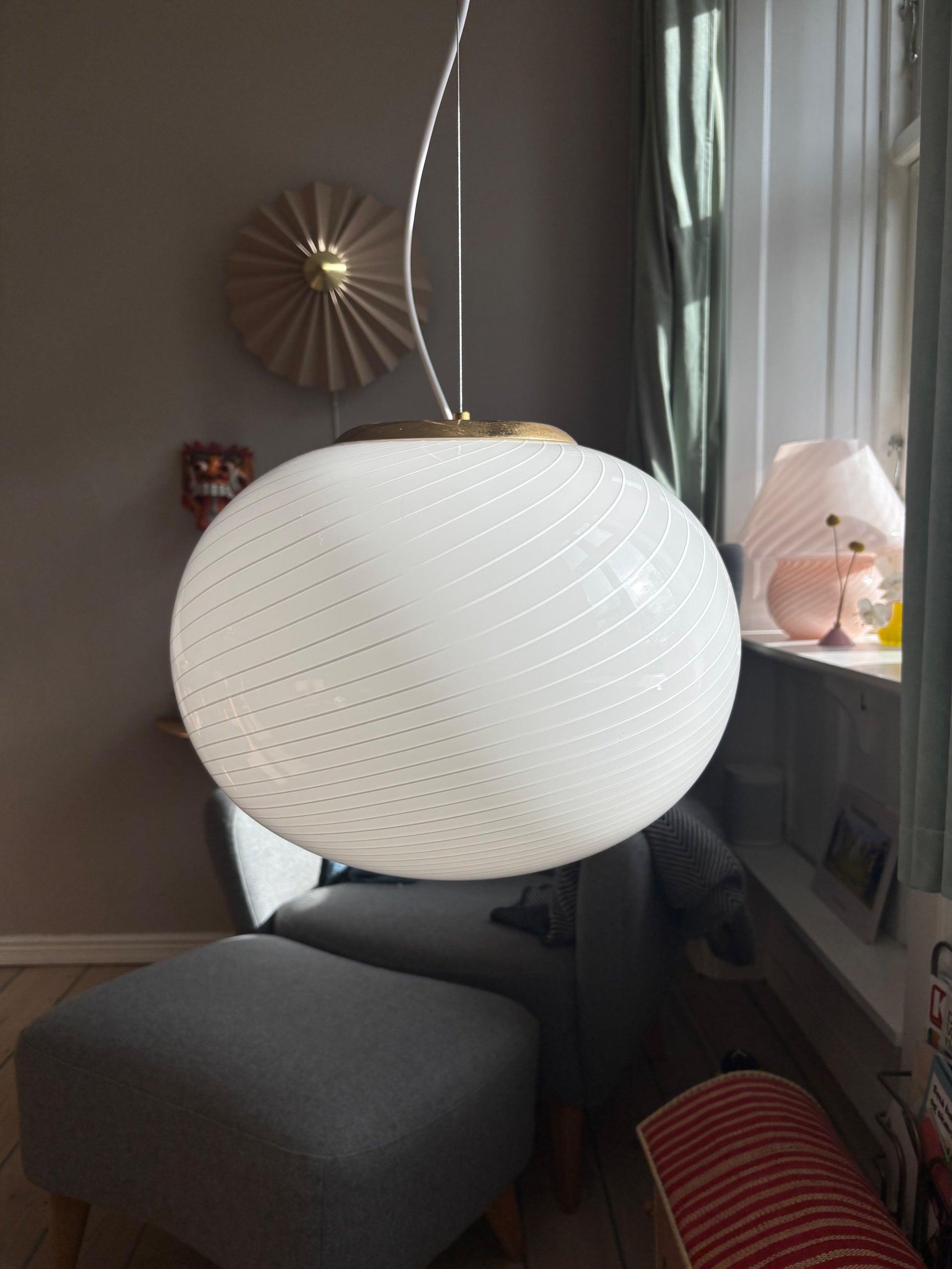 Lampen er enorm smuk i sit swirl. Glasset er mundblæst i en oval form med betagende swirl mønster. Da lampen er håndlavet kan der være små unikke kendetegn ved glasset.
