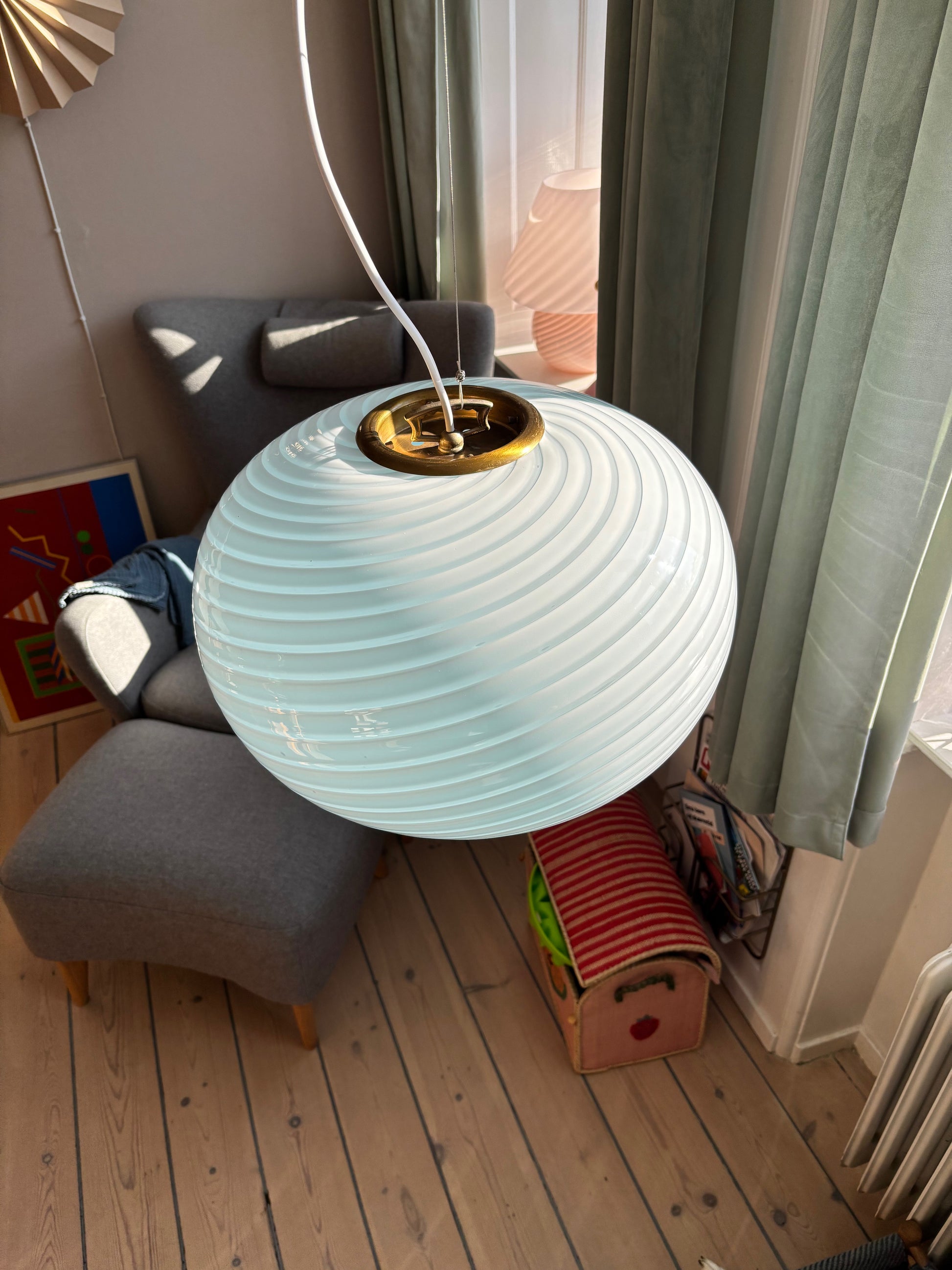 Kæmpe vintage Murano loftslampe i cloudblåt swirl med messing ophæng. Lampen er enorm smuk i sit swirl. Glasset er mundblæst i en oval form med betagende swirl mønster og er virkelig en sjældenhed!
