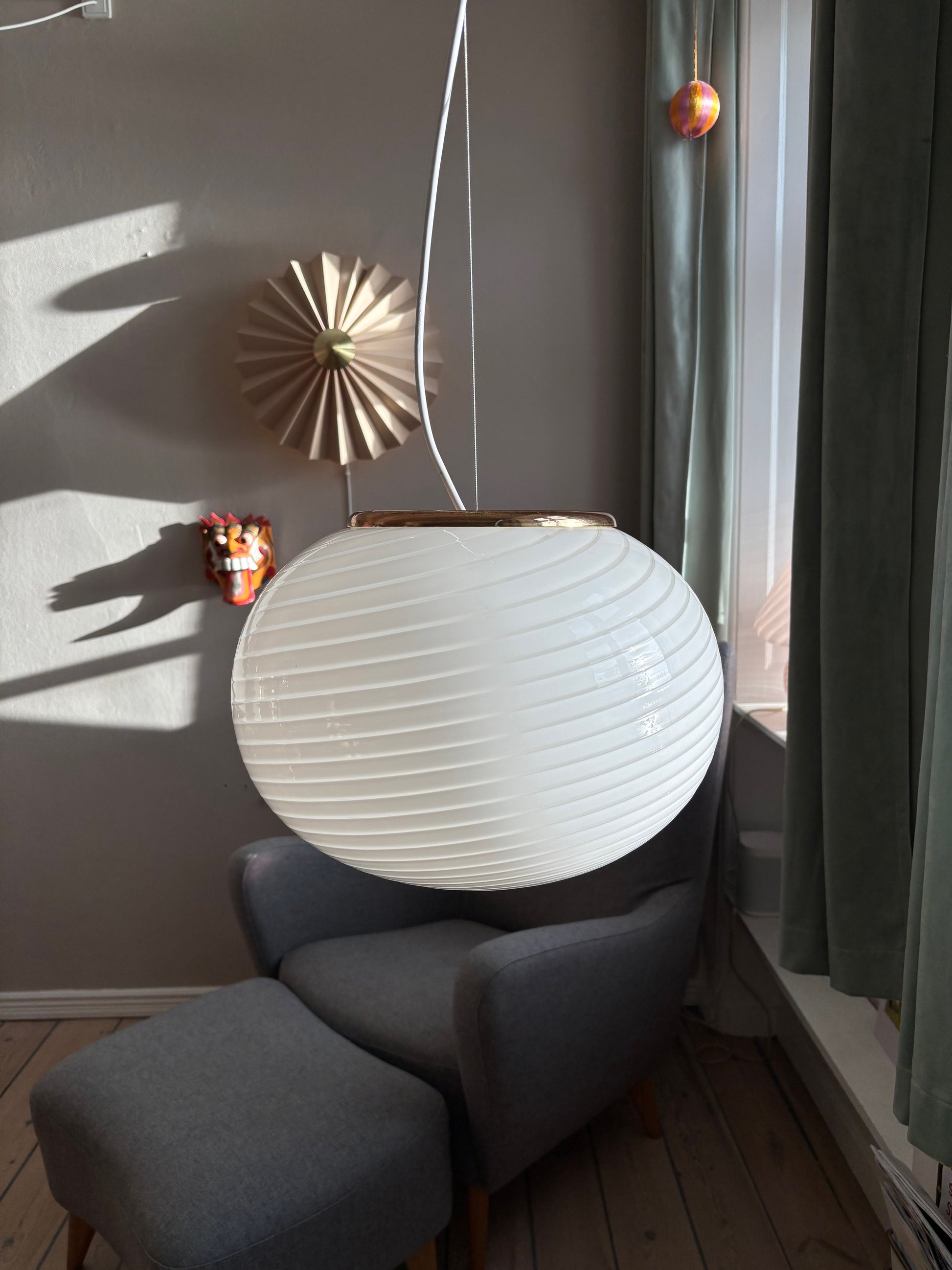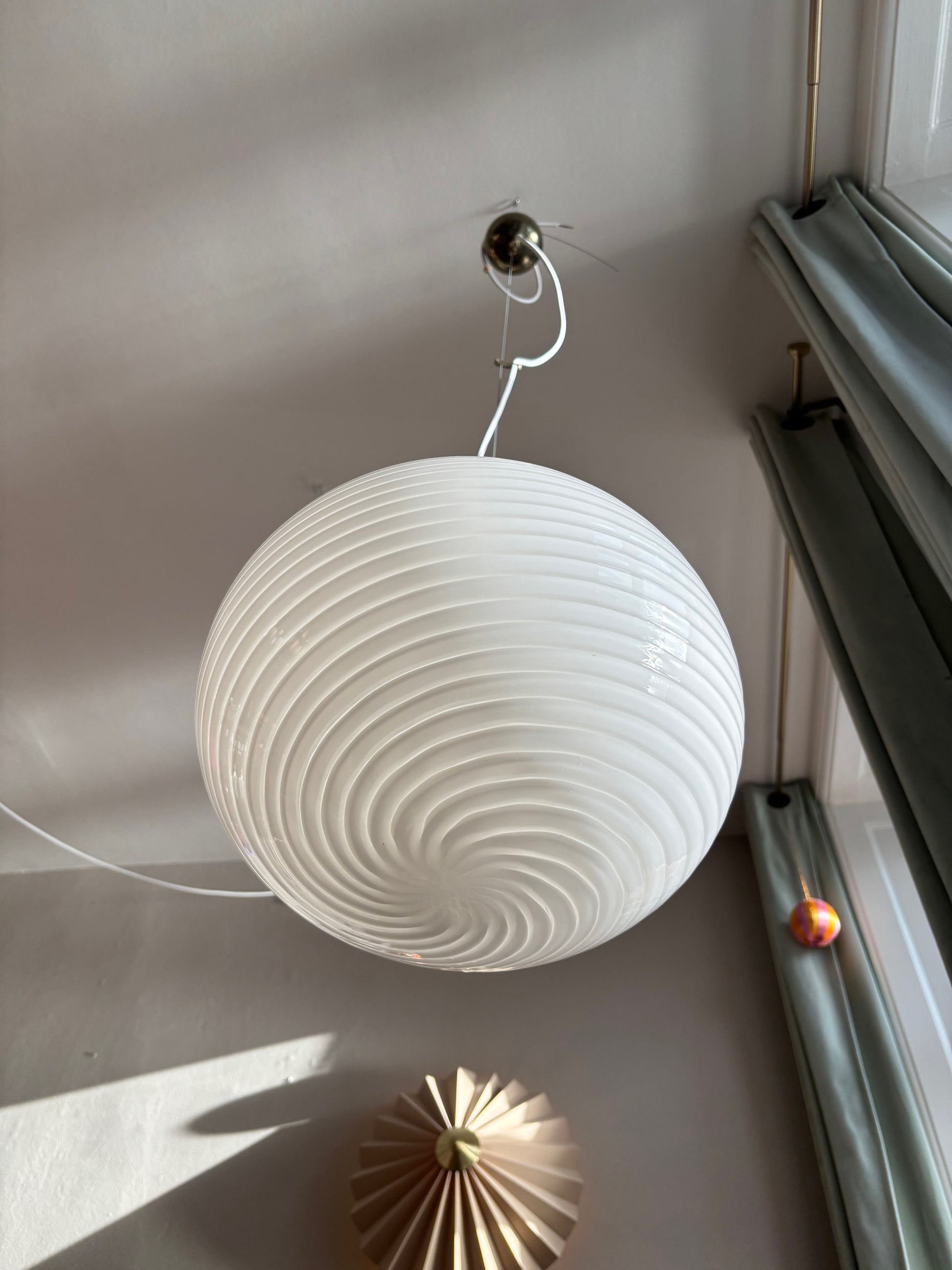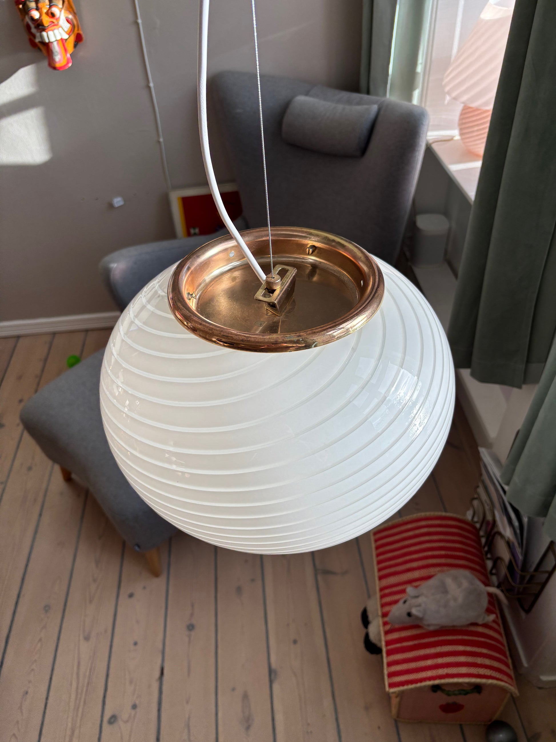 Vintage Murano loftslampe i hvid swirl med messing ophæng i den meget populære ovale udformning. Lampen er enorm smuk i sit swirl.